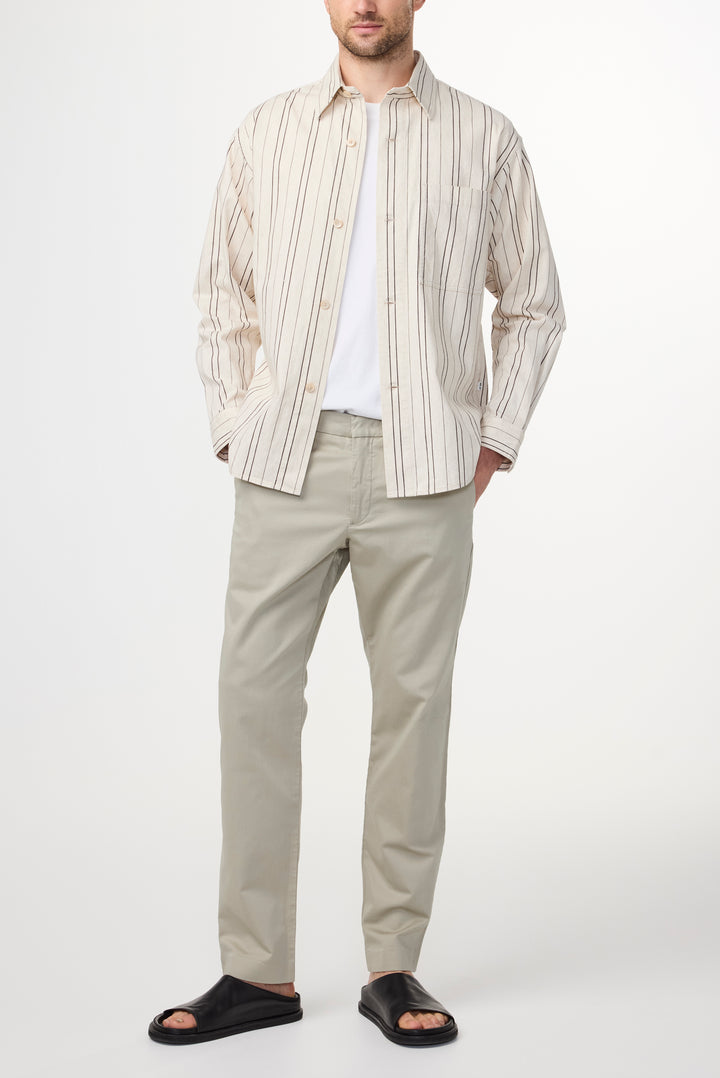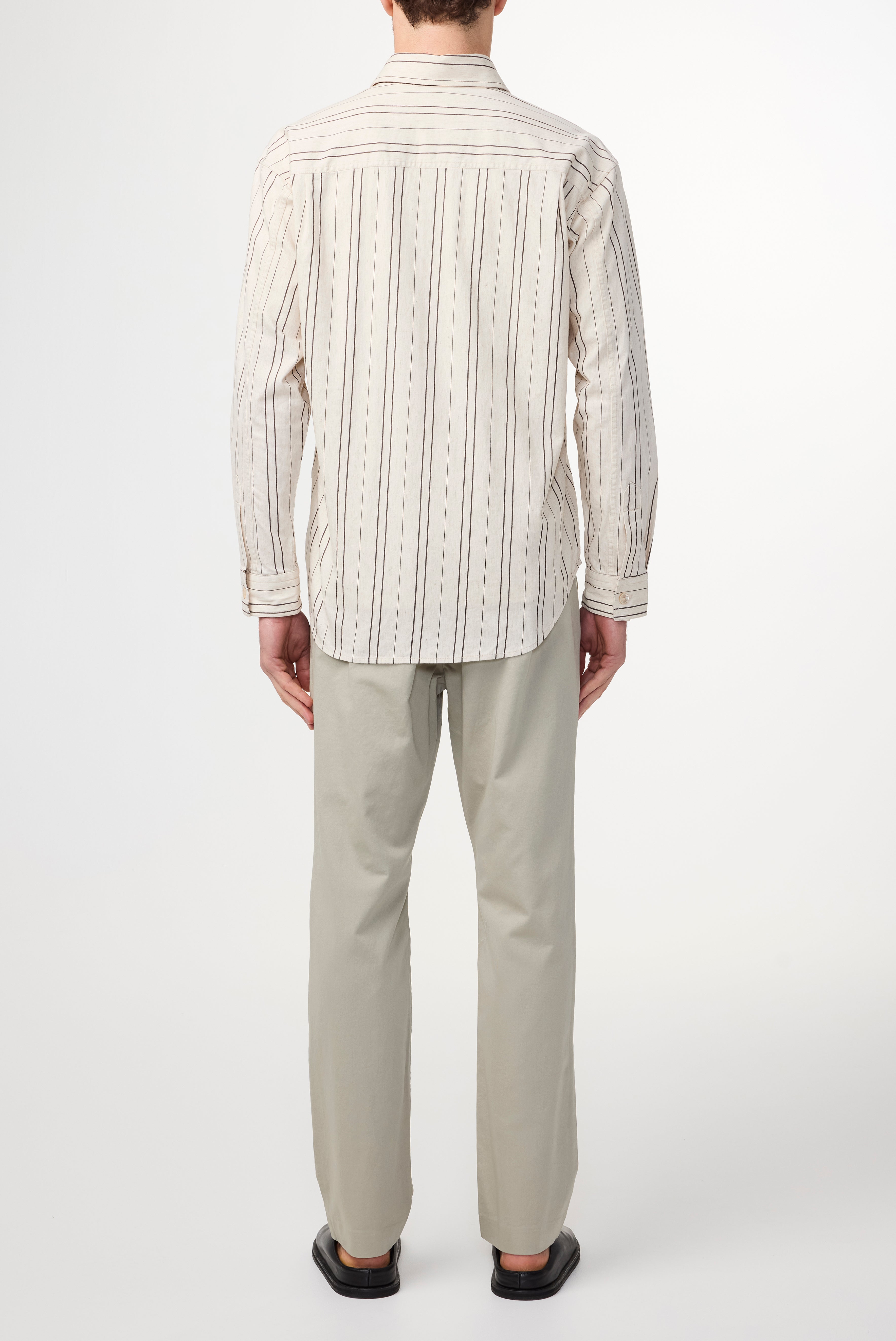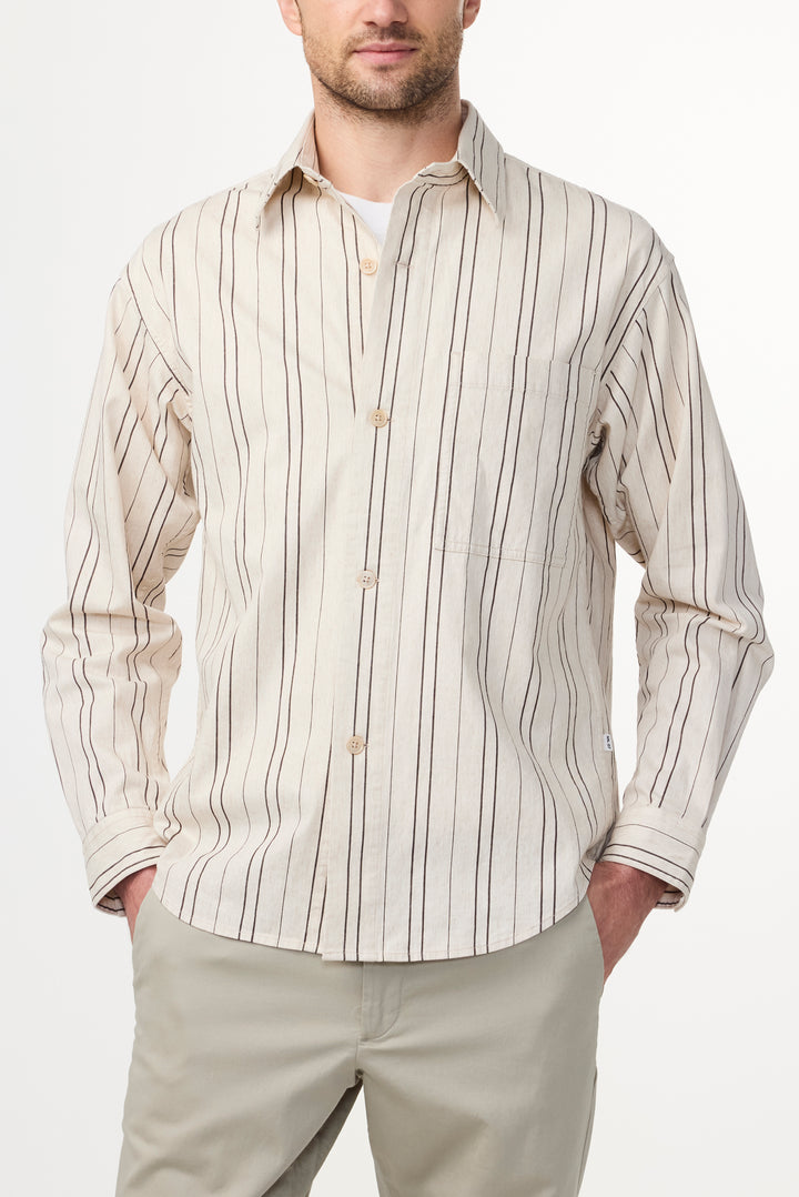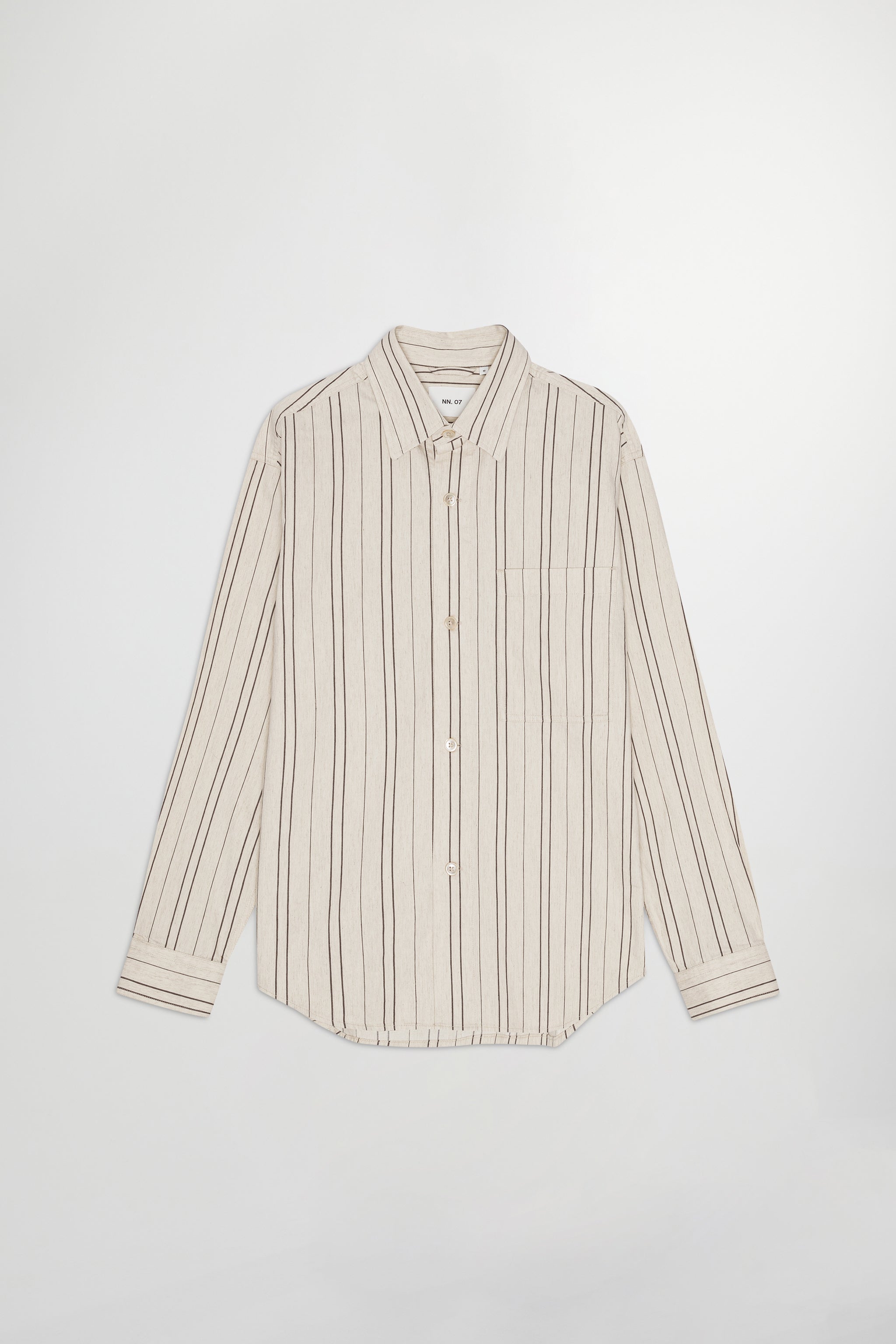 Striped long sleeve shirt crafted in a smooth linen and cotton-blend fabric. Topped with mother of pearl buttons.