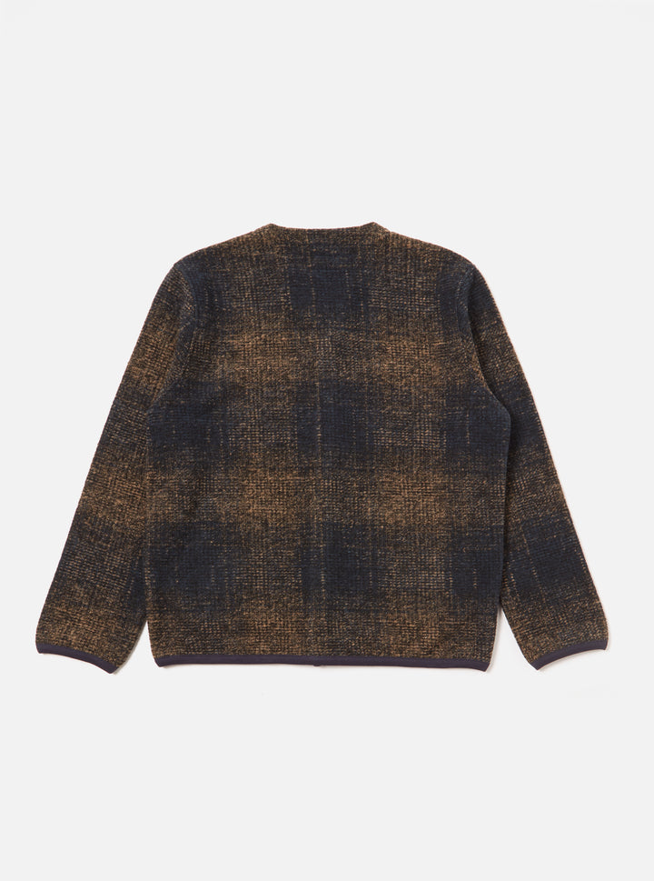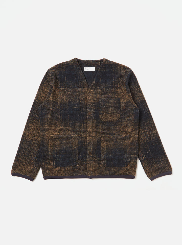 An easy-to-wear cardigan that has a self-bound button front, three outer patch pockets and a fourth on the inside. With cotton rib-bound cuffs and hem.