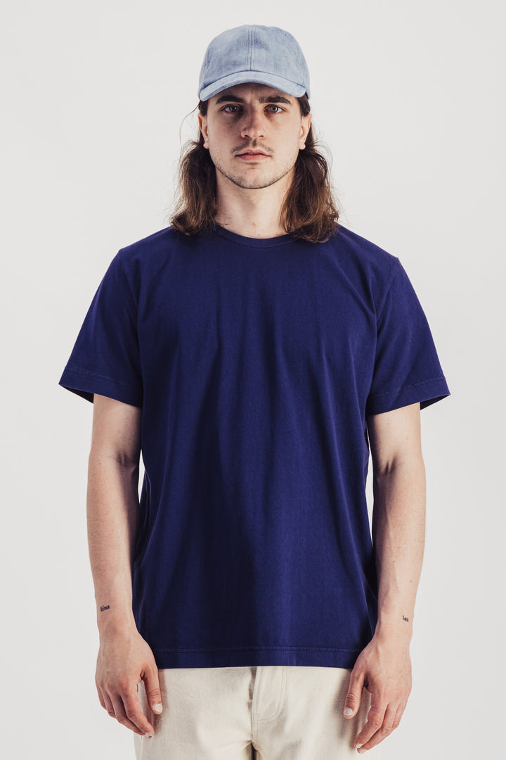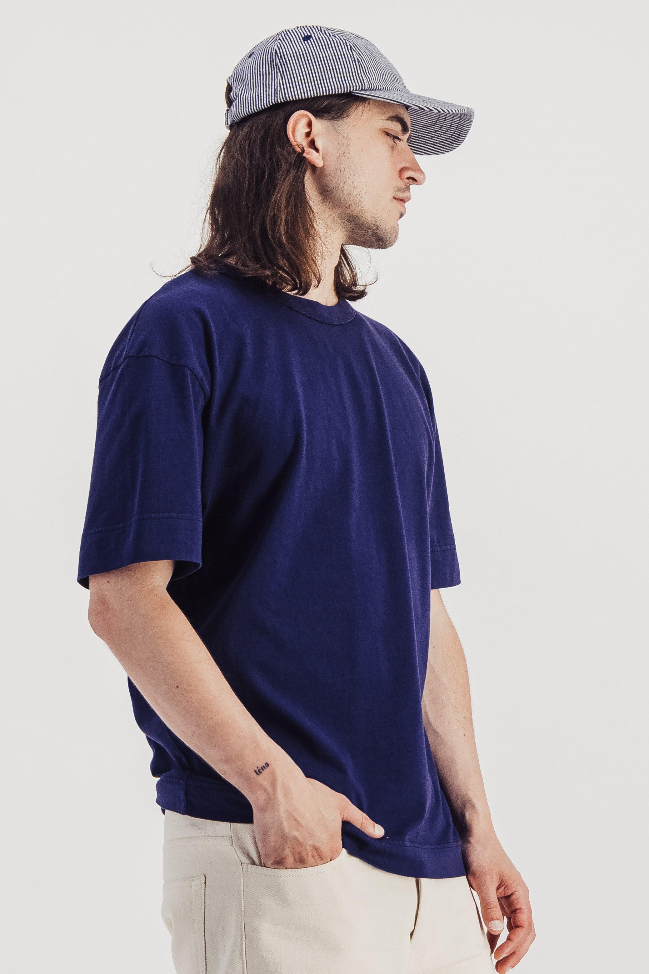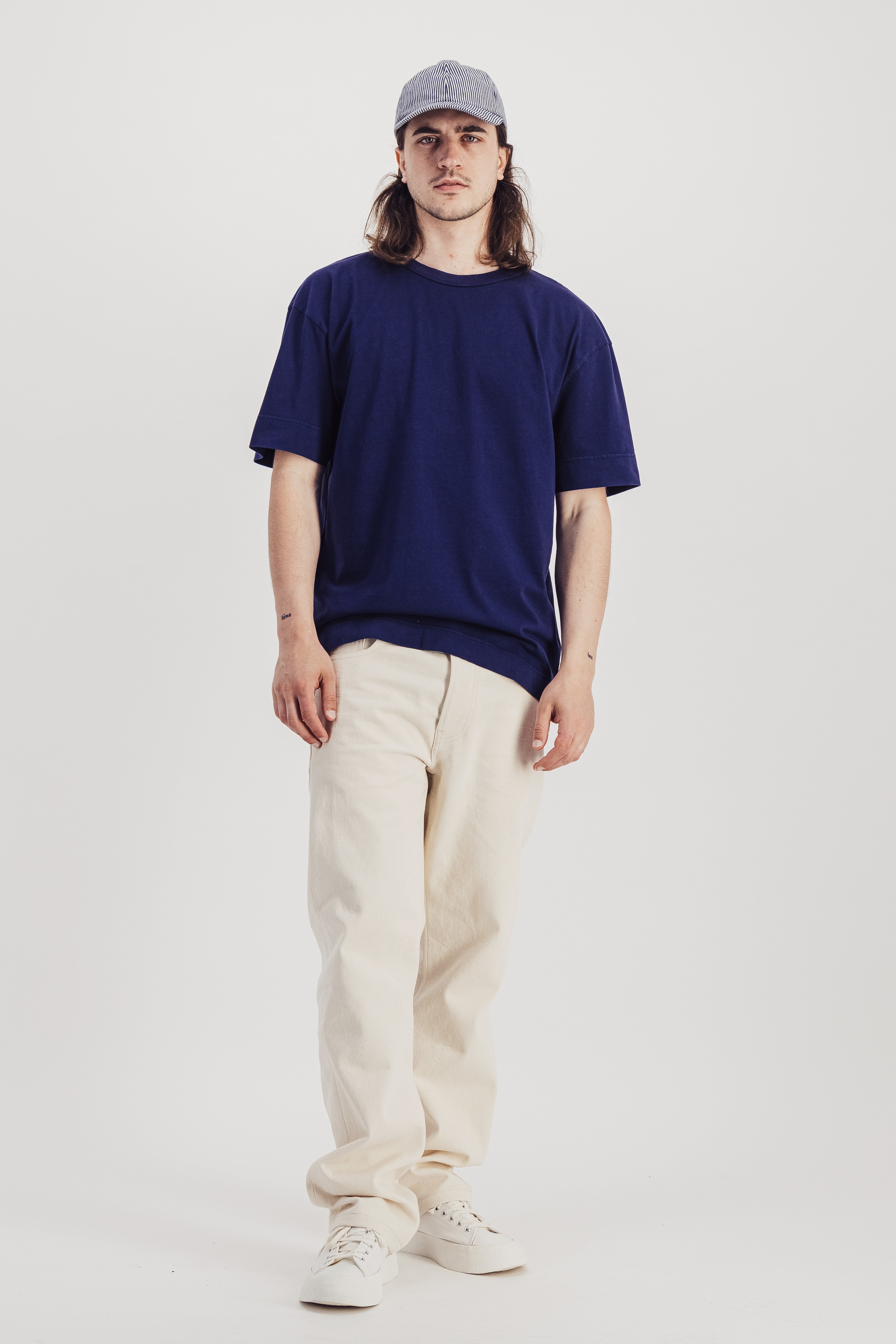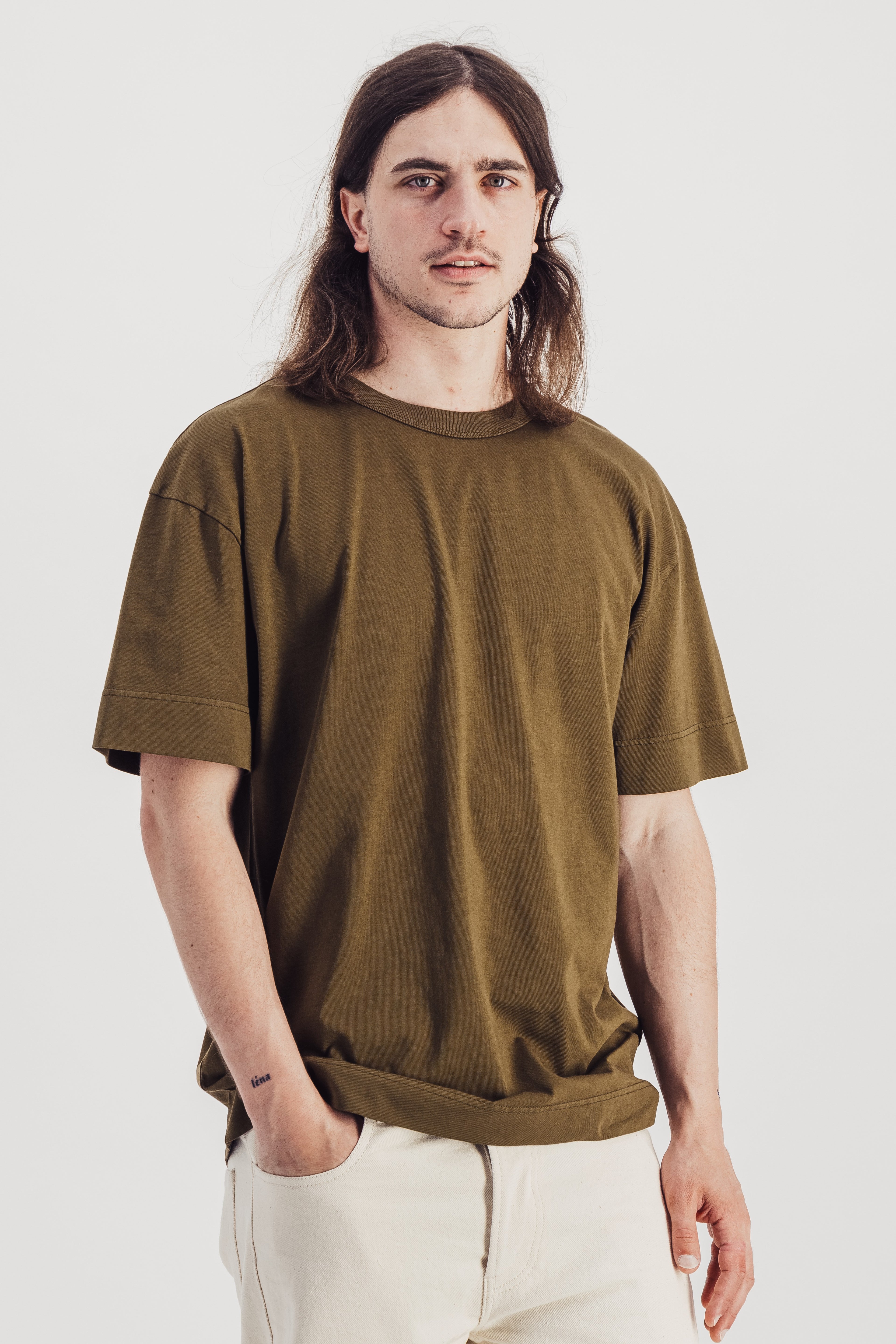 Drop-shoulder tee that drapes loosely and comfortably. The garment dye adds softness to the touch and a gentle vintage hue to the color.