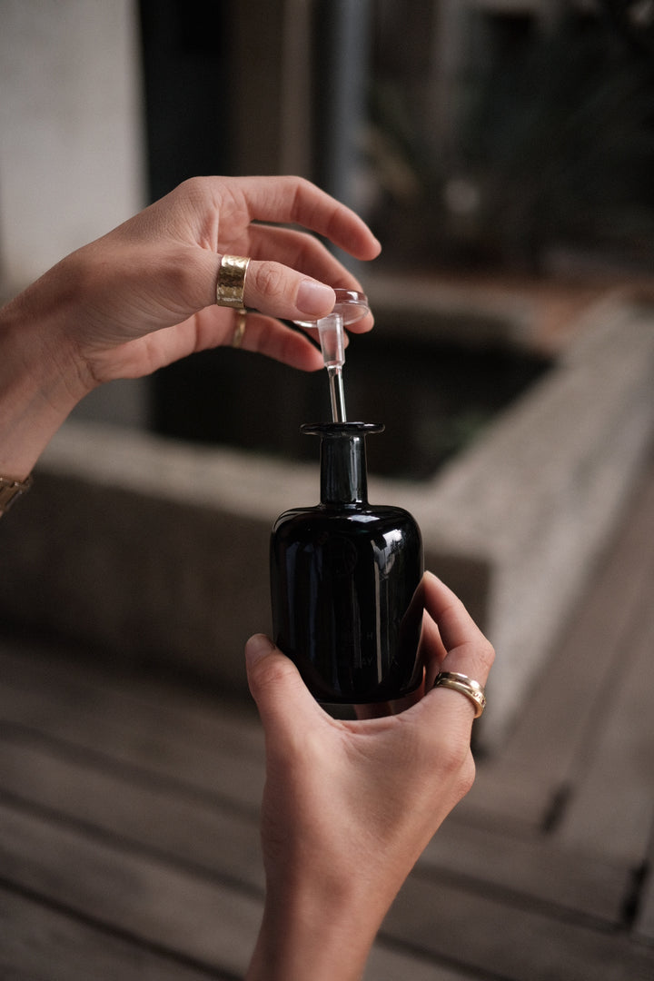 A gentle balance of soft green and cool spices with a lingering smokiness. Cade and juniper wood intertwined with galbanum and elemi Iran fused with a leathery isobutyl quinoline and cistus absolute.