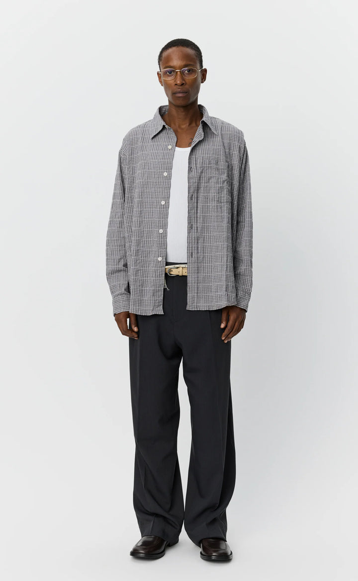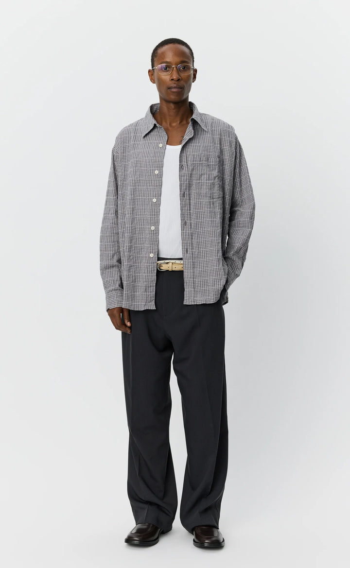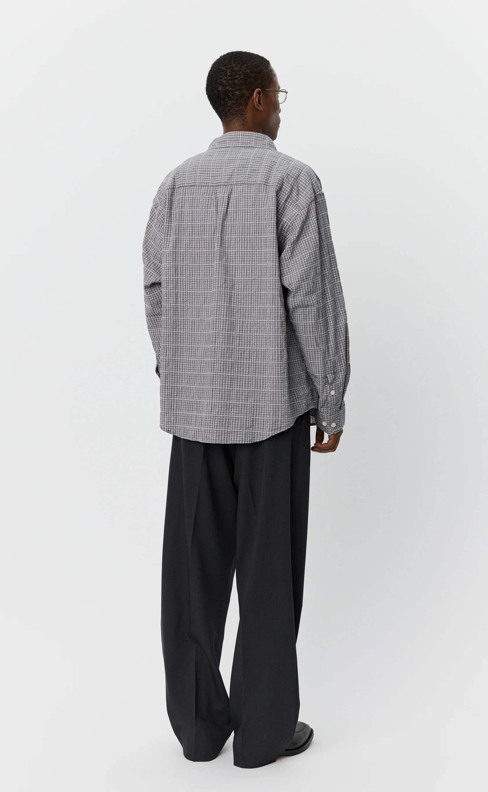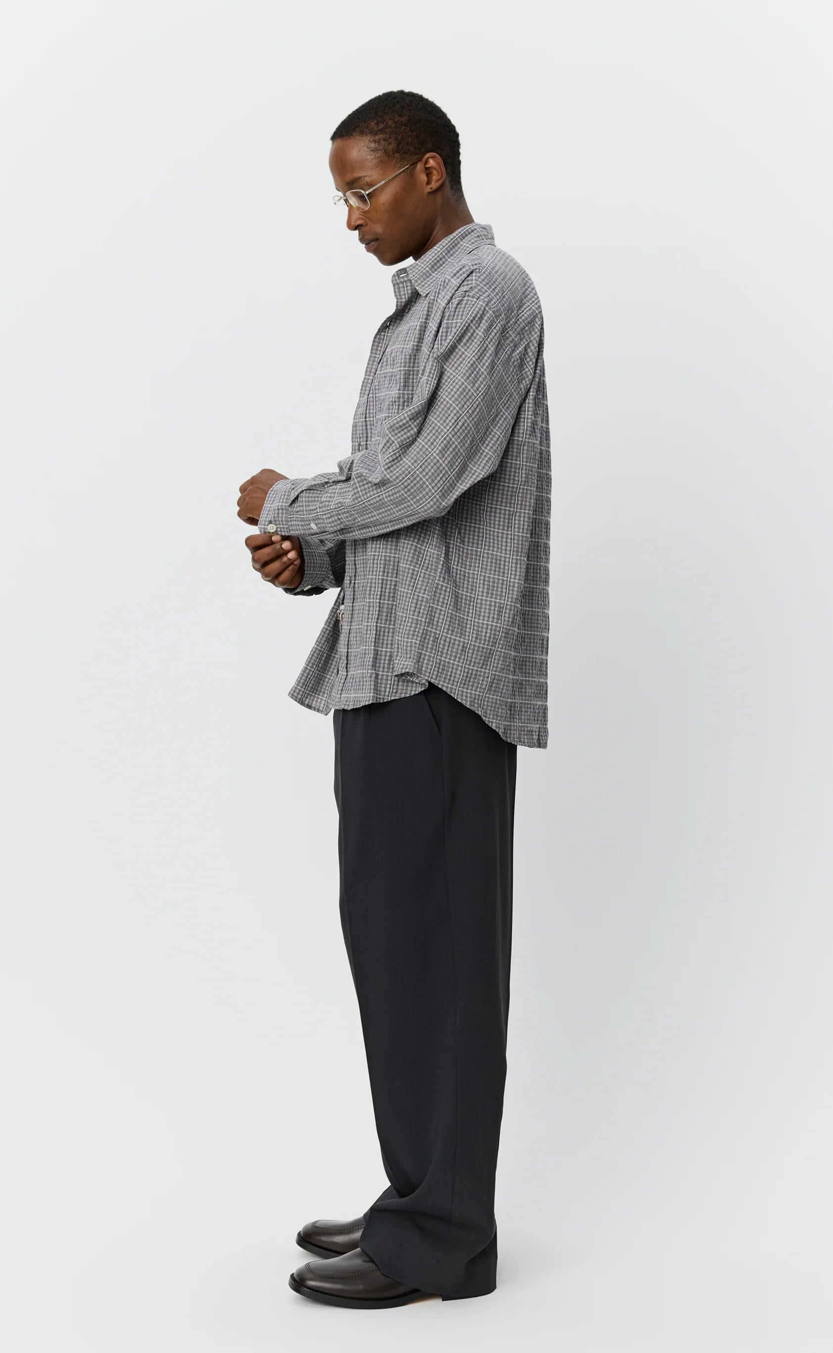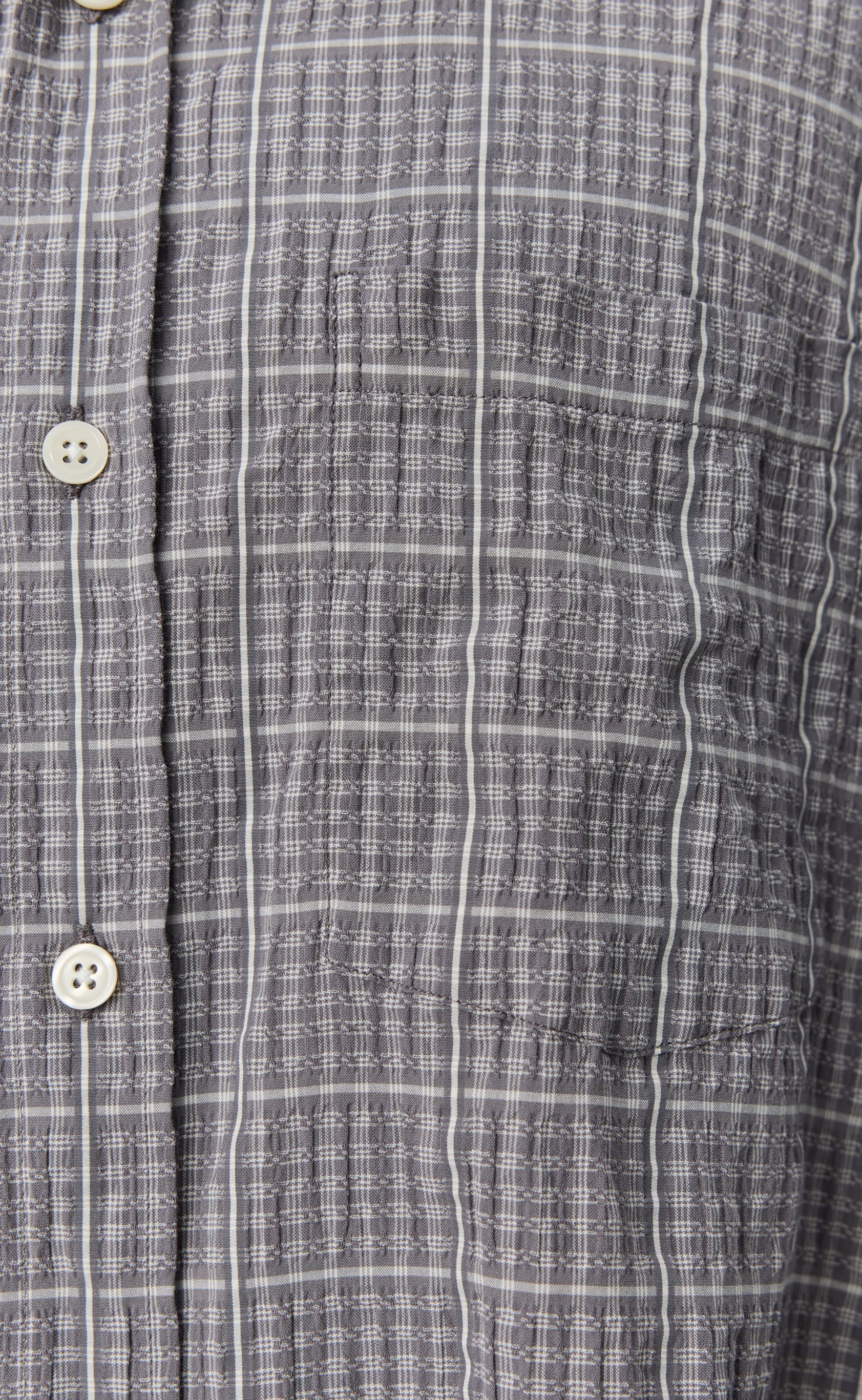 The Executive Shirt has a relaxed fit with drop shoulders and a rounded hem. Featuring a button placket, spread collar, back yoke pleats and a chest pocket. Cut from a finely textured cotton with a dry hand feel, in a white multi check on a light grey ground.
