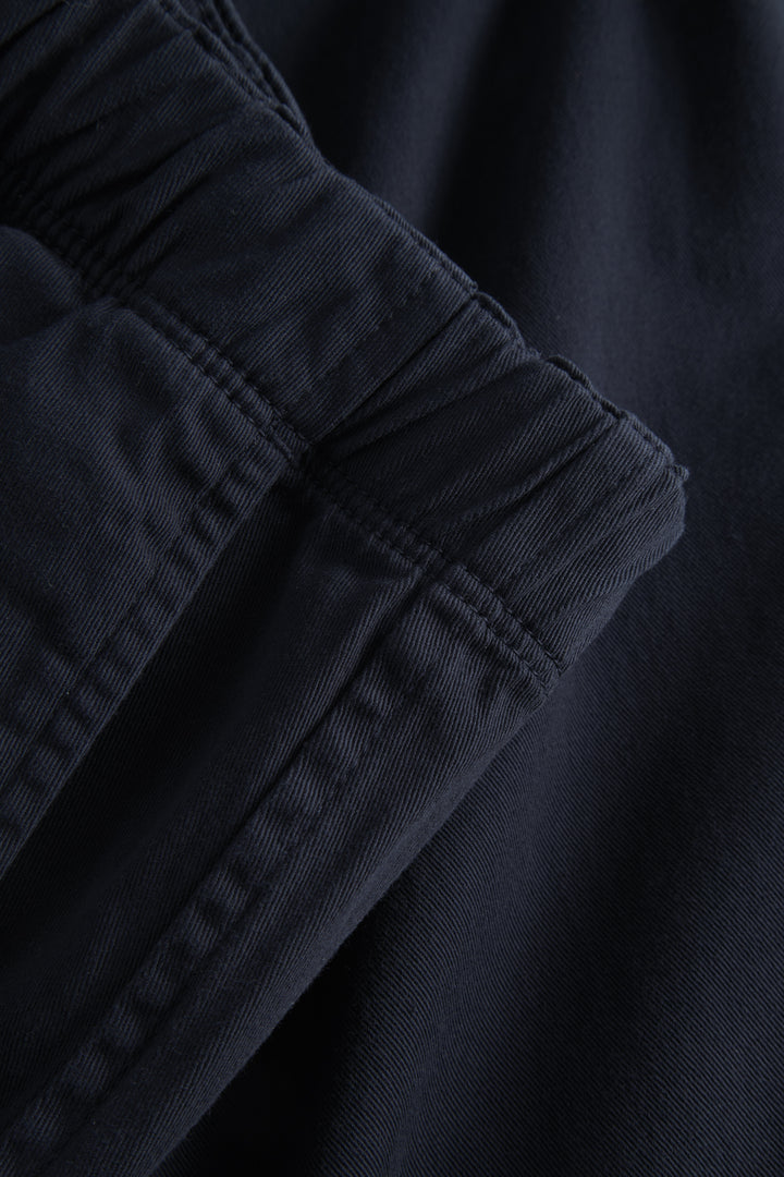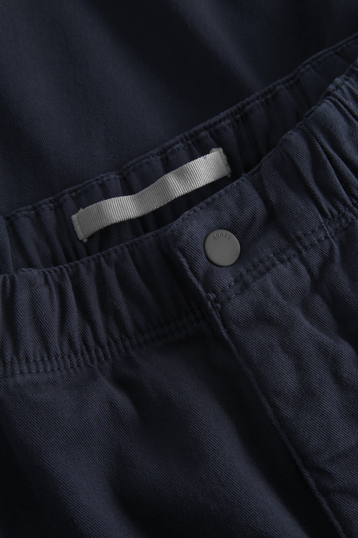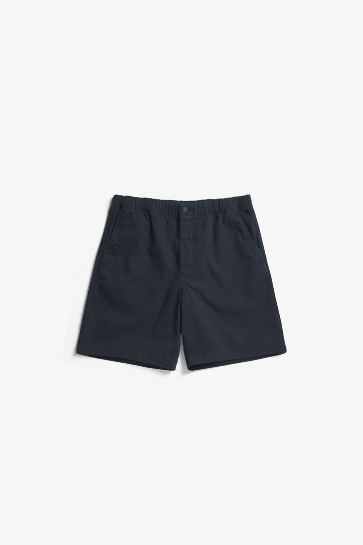 A relaxed fitting short with a loose leg constructed from a stretch organic cotton twill. The pants are garment-dyed for a rich colour. Finished with a zip fly, snap closure and drawstring waist.