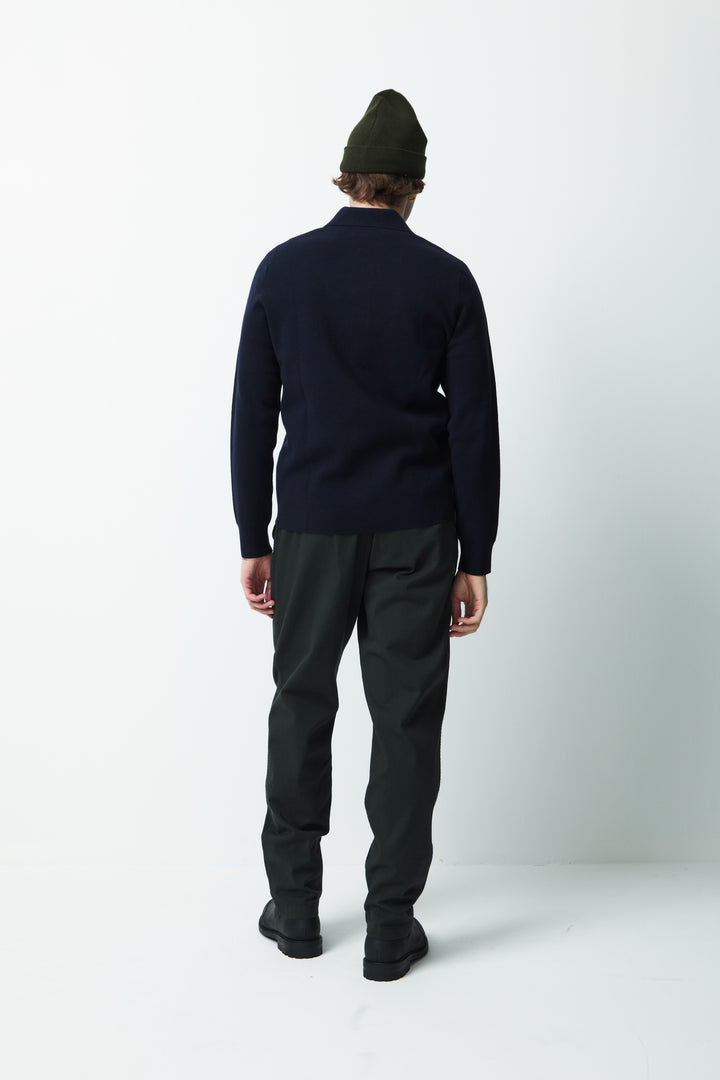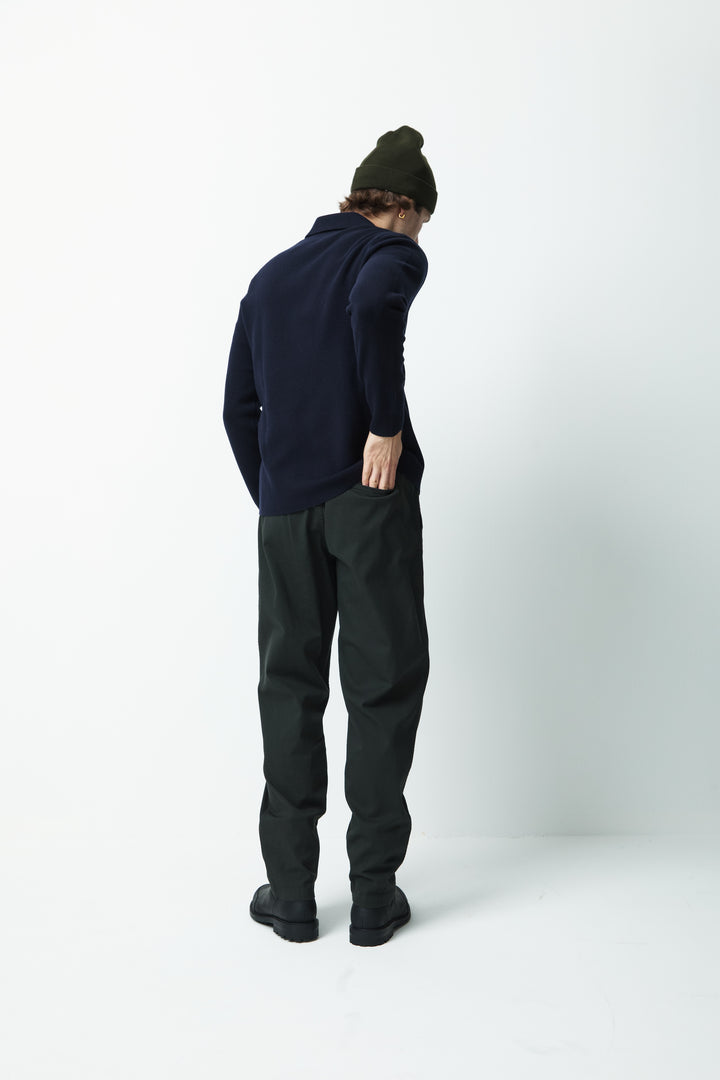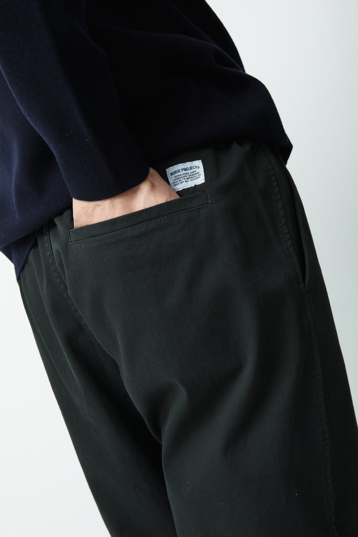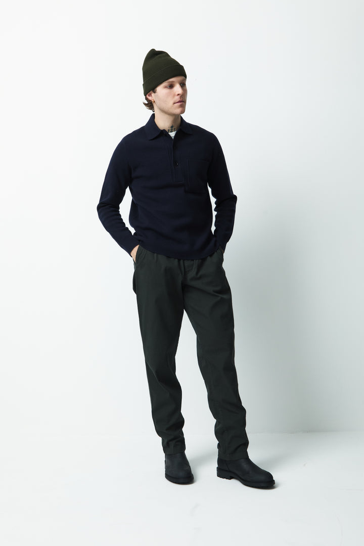A relaxed fitting pant with a loose leg and elasticated waist constructed from a stretch organic cotton twill. The pants are garment-dyed for a rich colour. Finished with a zip fly, snap closure, drawstring waist and a branded tab at the back.