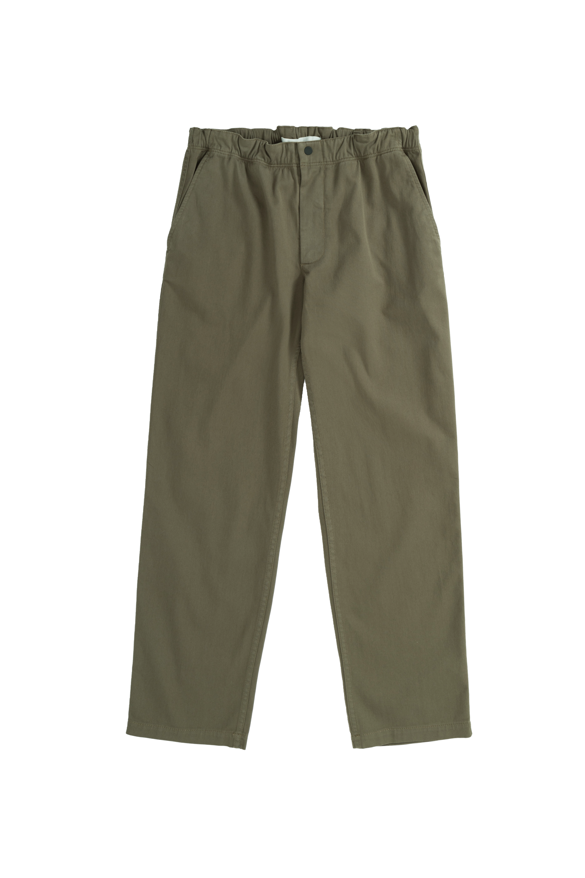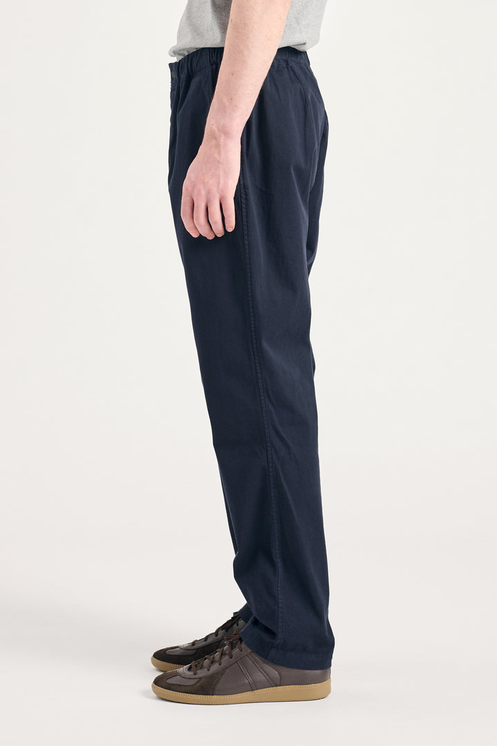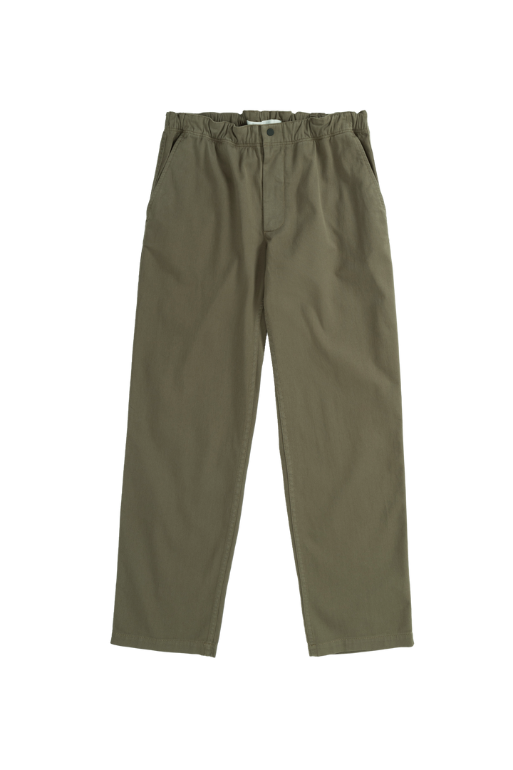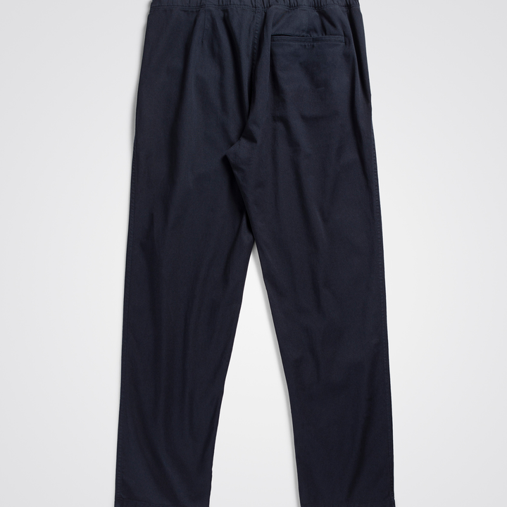 Relaxed fitting pants with a loose leg constructed from a stretch organic cotton twill. The pants are garment-dyed for a rich colour. Finished with a zip fly, snap closure and drawstring waist.