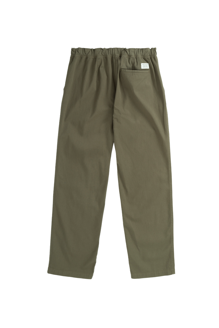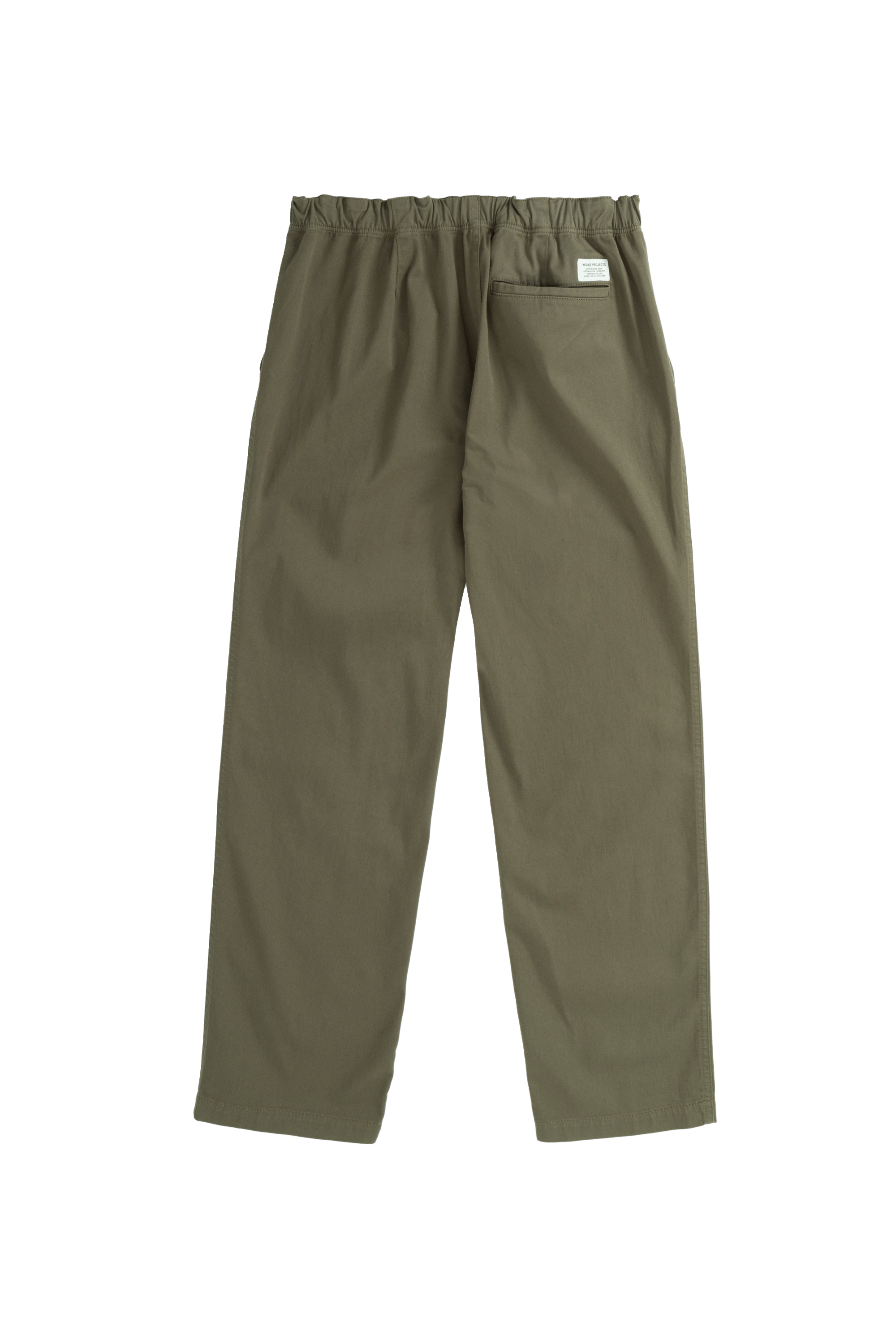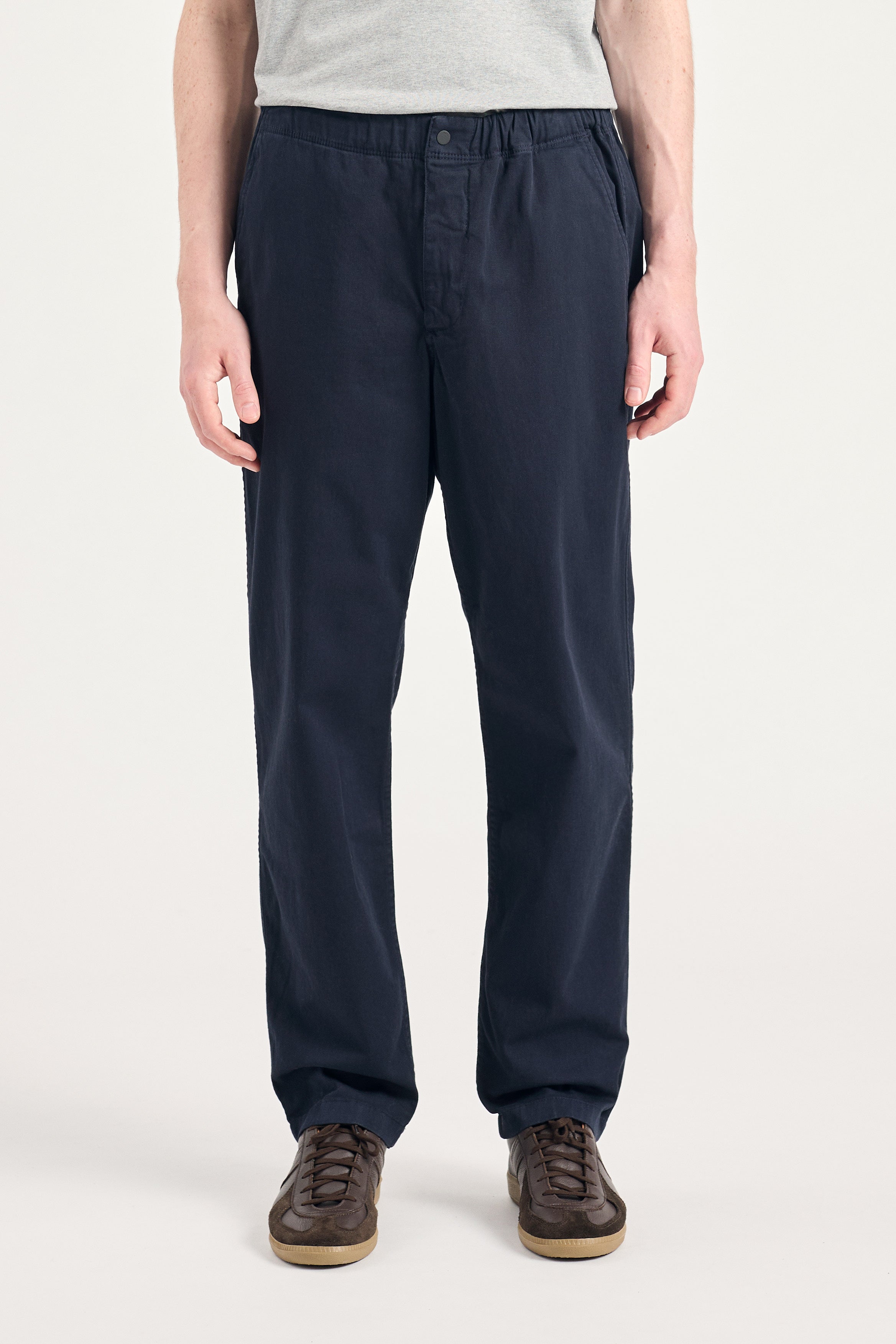 Relaxed fitting pants with a loose leg constructed from a stretch organic cotton twill. The pants are garment-dyed for a rich colour. Finished with a zip fly, snap closure and drawstring waist.