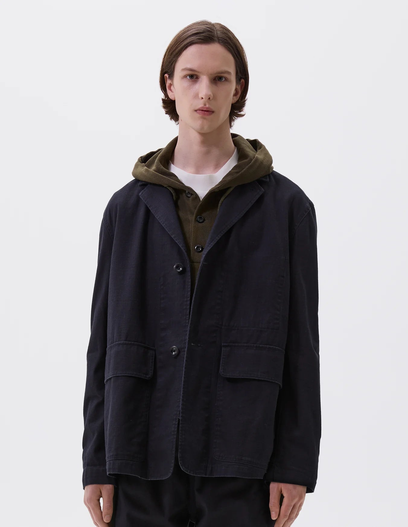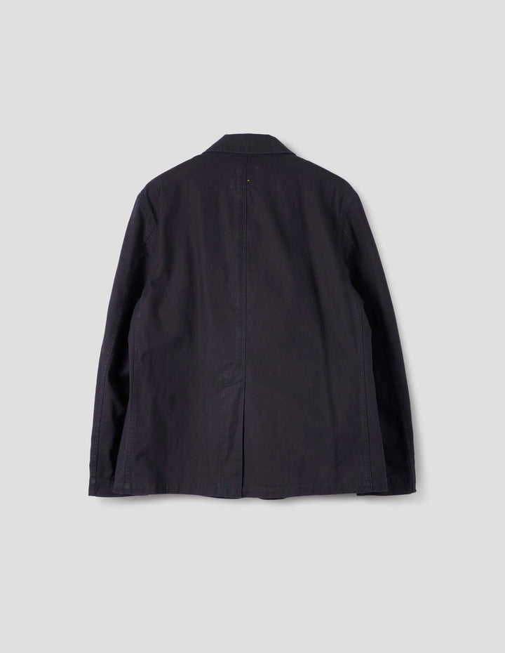 This blazer style jacket is cut with cotton drill that fades with wash and wear like true indigo, enhancing the character of the garment over time.
