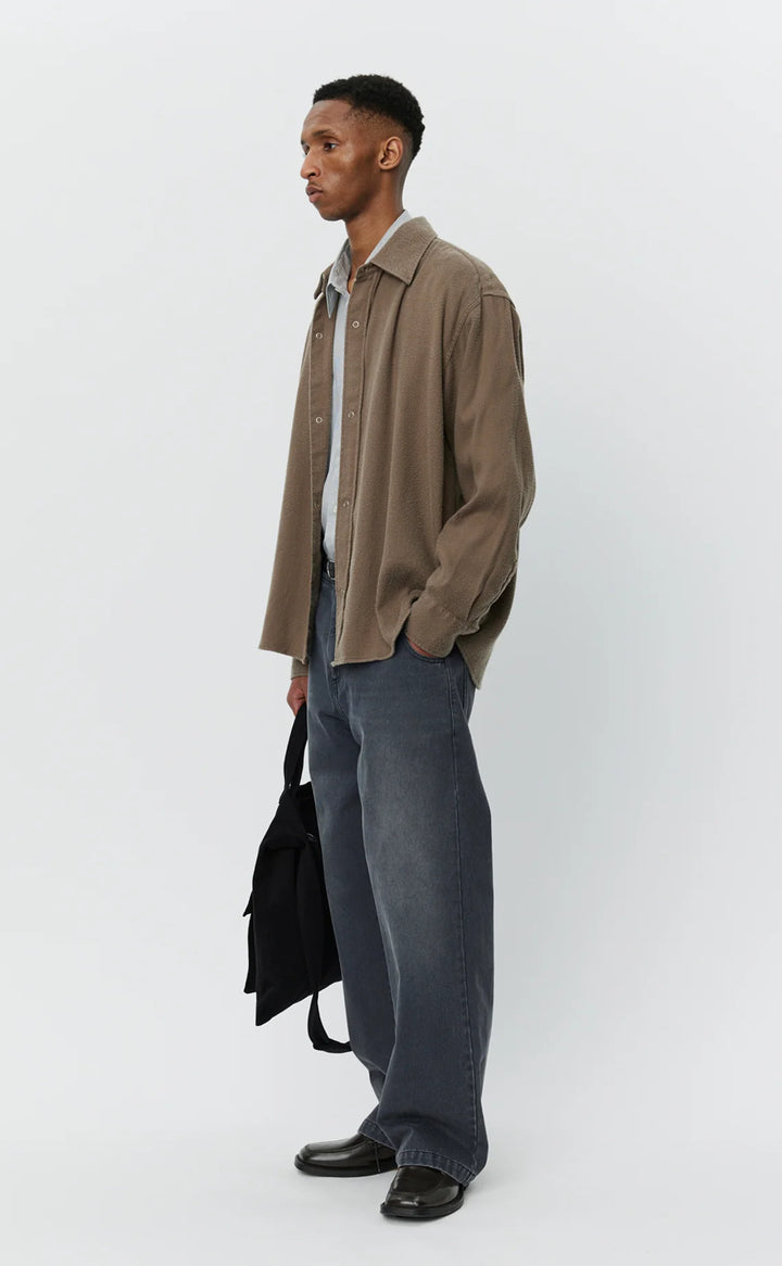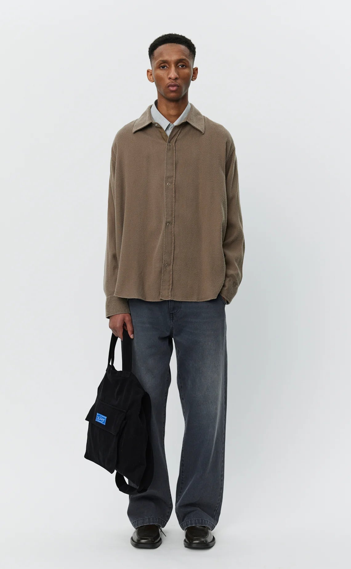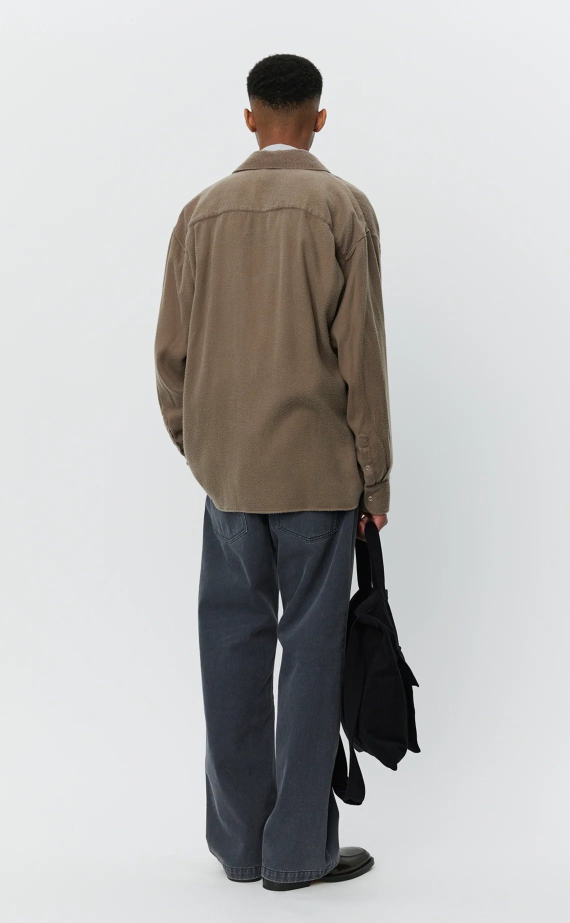 The Gambler Shirt has an oversized fit with drop shoulders and a curved hem. Featuring a spread collar and snap button placket. Cut from a soft, garment dyed Tencel® jersey with a subtle pilling effect in a muted brown.