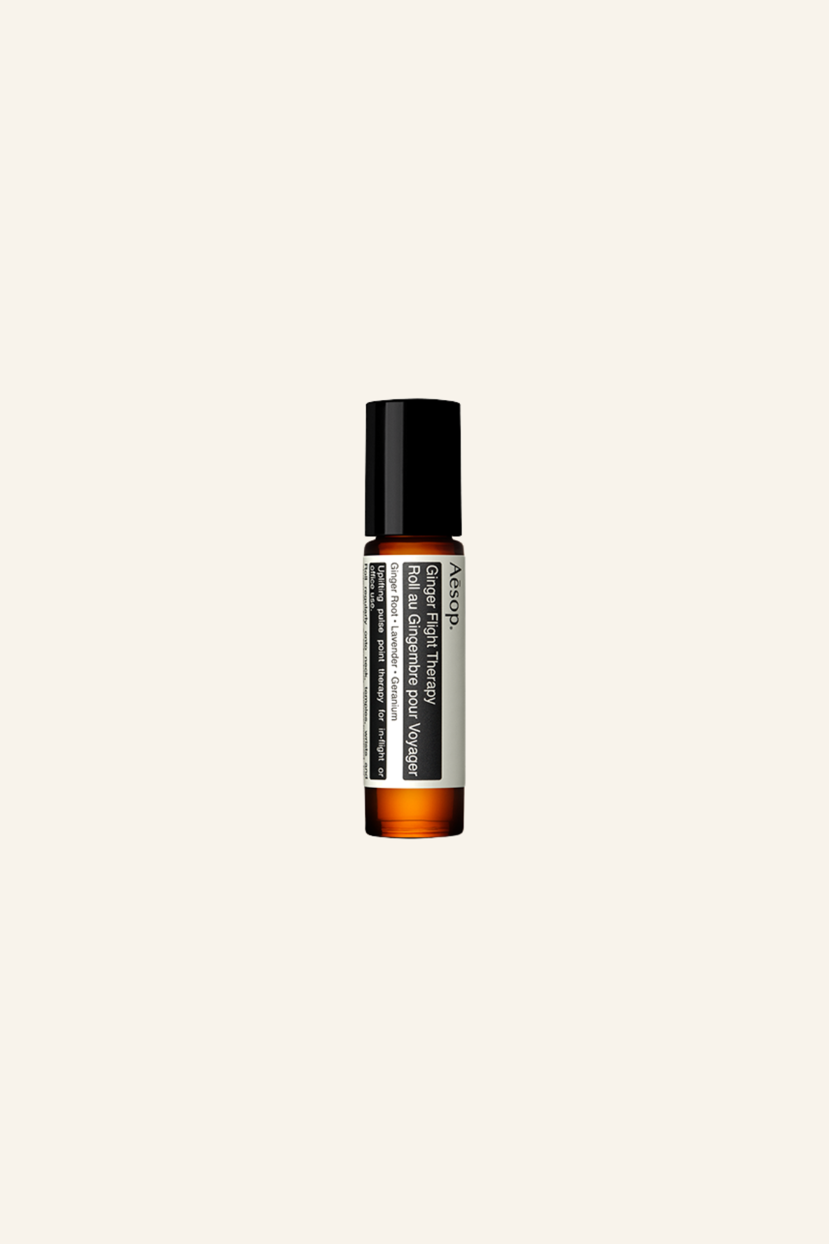 A pulse-point therapy roll-on enhanced with oils of Ginger Root, Lavender and Geranium for in-flight or office use.