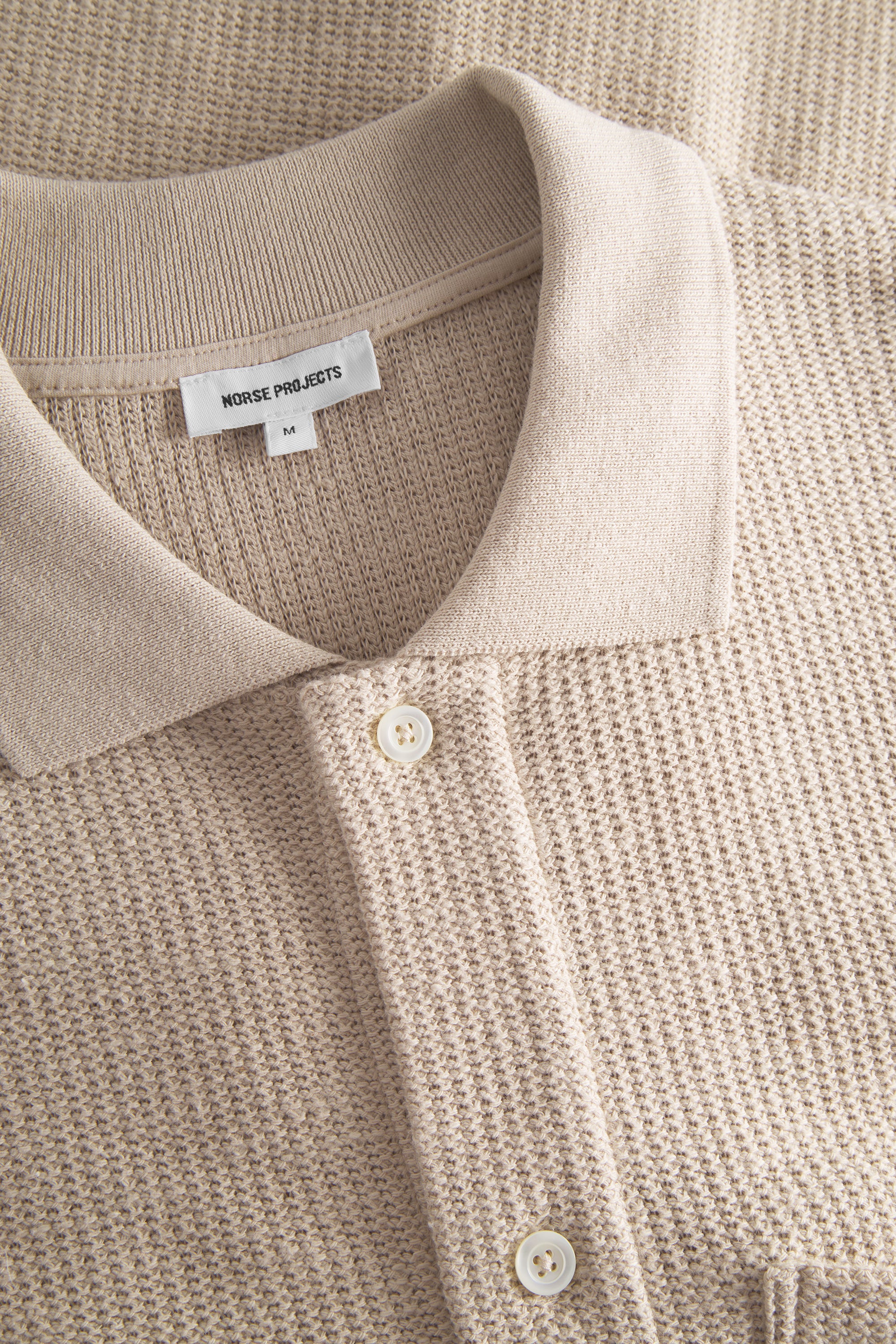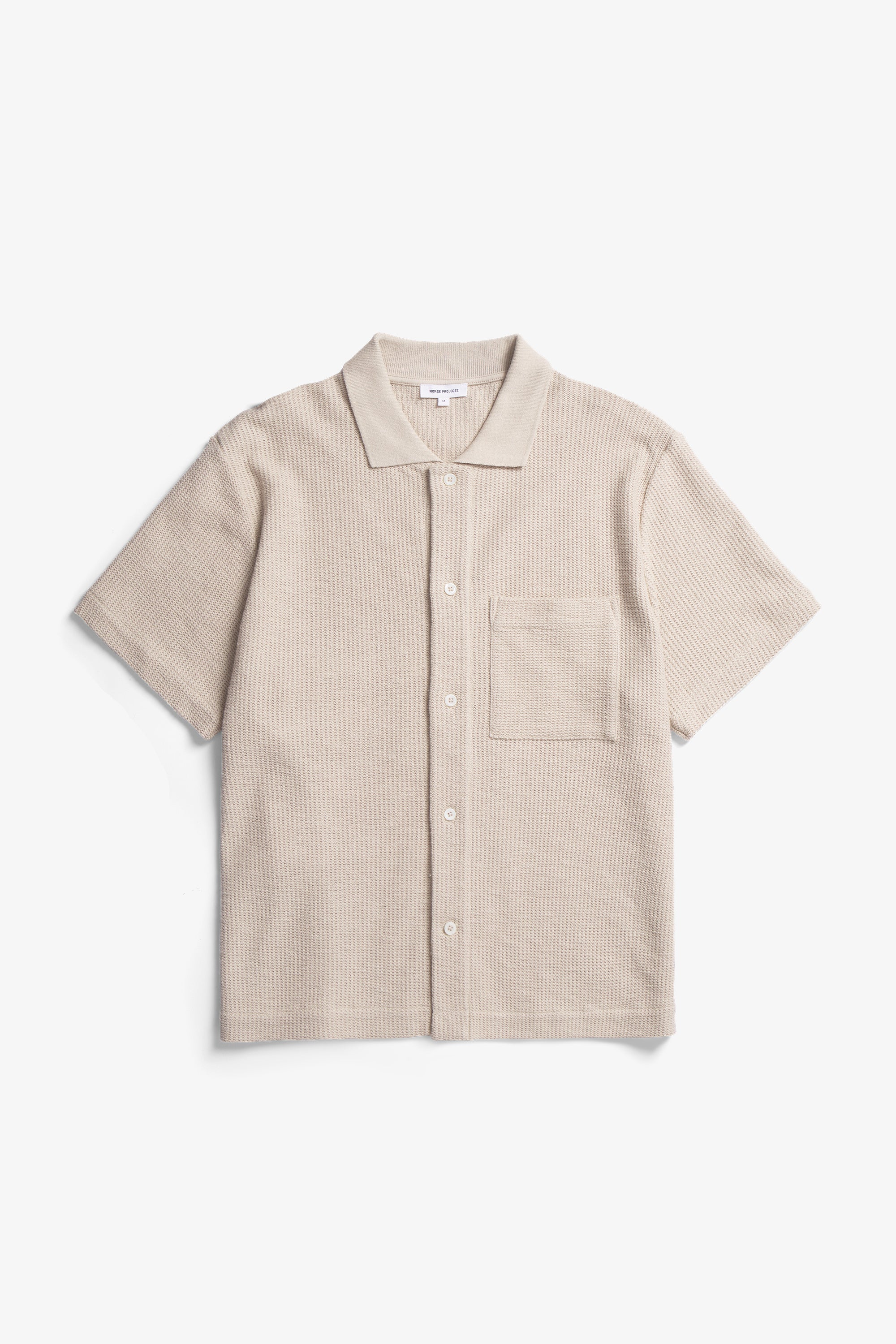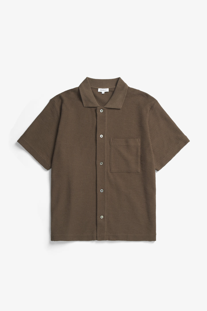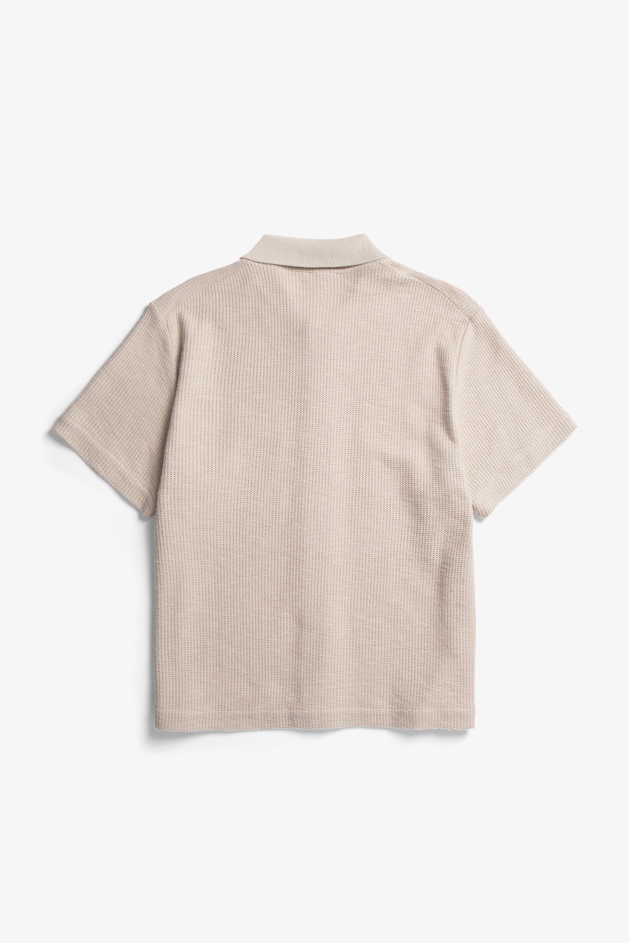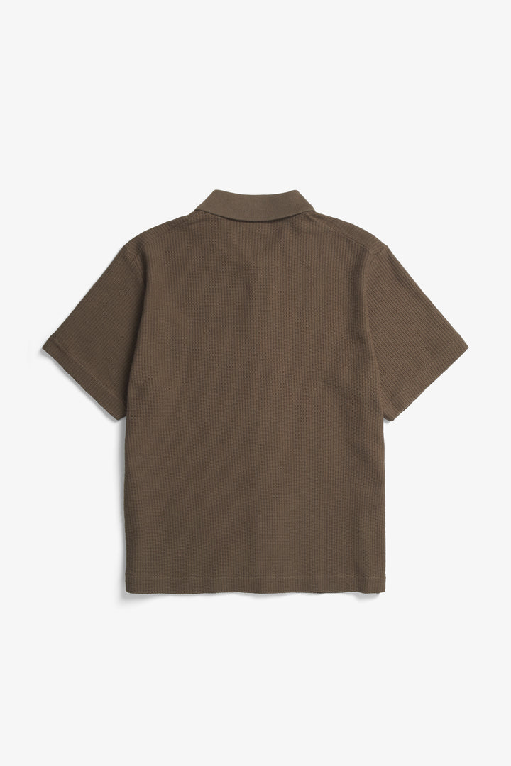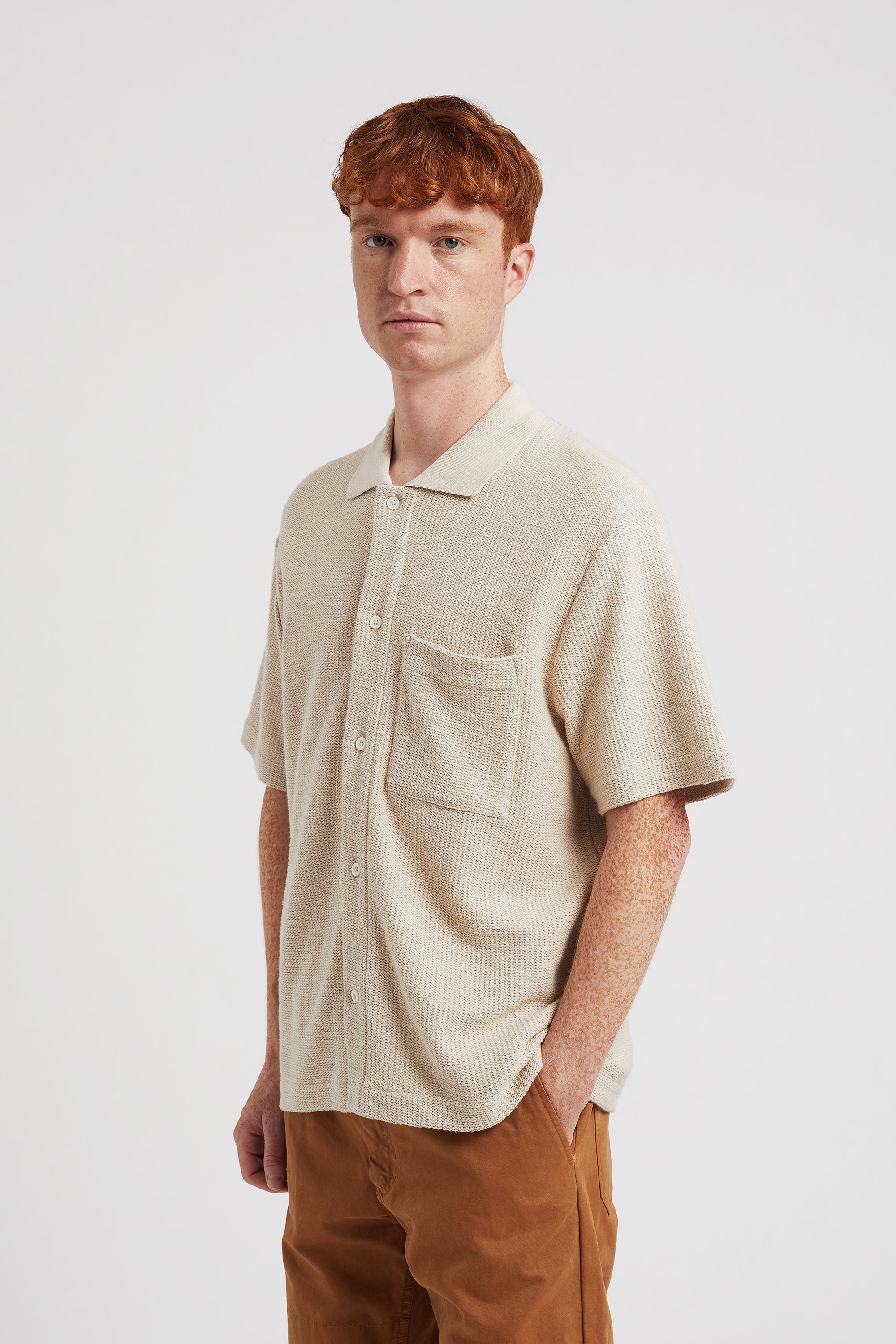 A relaxed fitting short sleeve shirt cut from a heavyweight jersey with a breathable open structure. It features a knitted collar, a chest pocket and button through placket.
