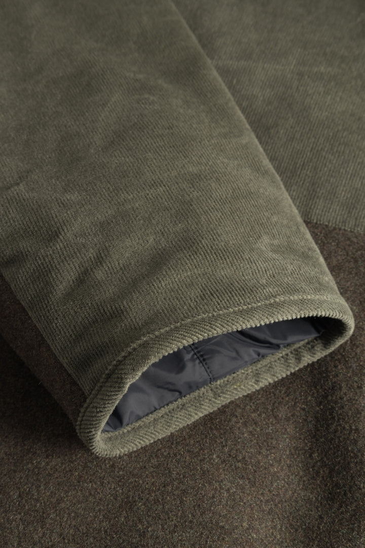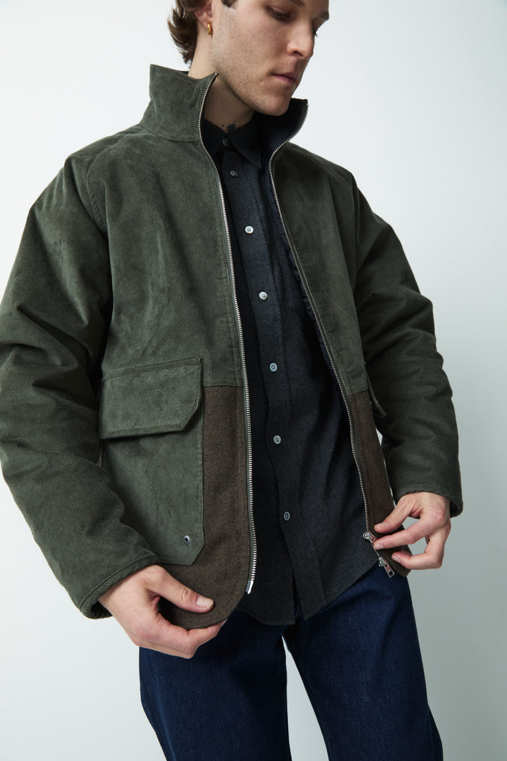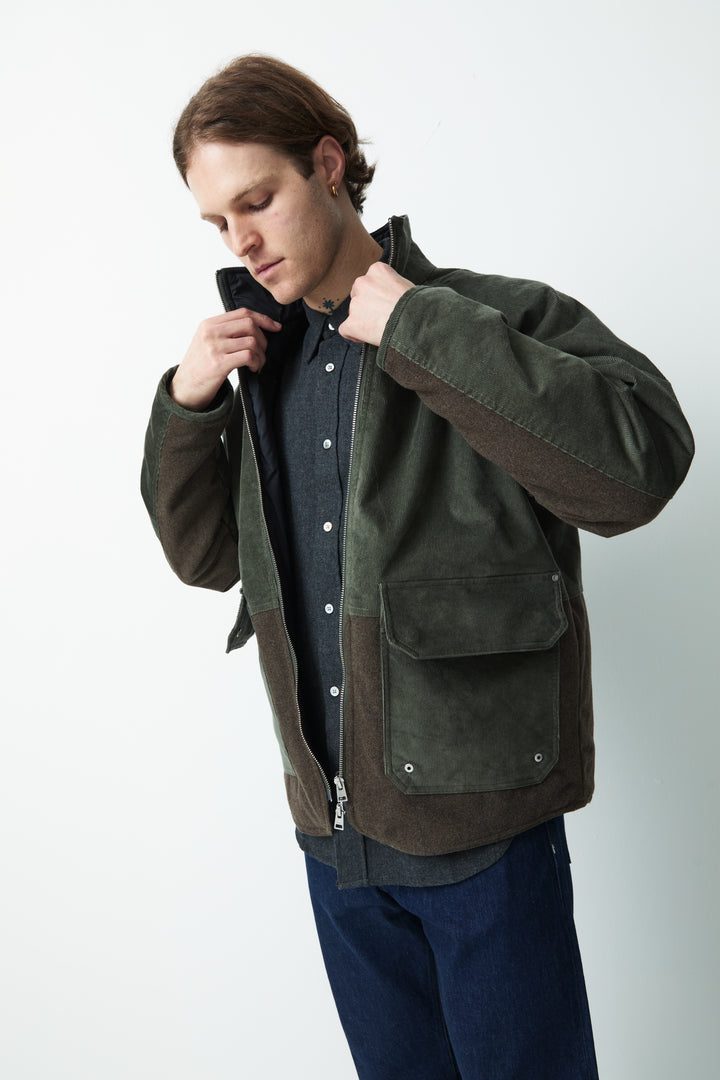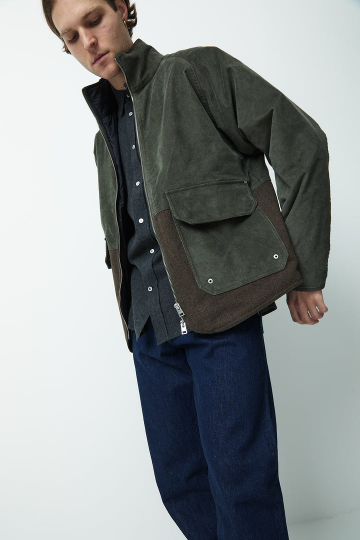 An insulated zip-through jacket, constructed from a combination of corduroy and Melton wool. A corduroy cloth woven with SOLOTEX® yarns provides the base of the style, whilst durable Melton is used to panel the undersleeve, and lower body. This style has a shaped hem, raglan sleeves, and lower patch pockets. A convertible collar allows the wearer to zip up to the chin, or fold down for an open collar look. Finished with a zip front closure. SOLOTEX® is a yarn with a spring-like helical molecular structure giving excellent stretch and recovery for uncompromising comfort.