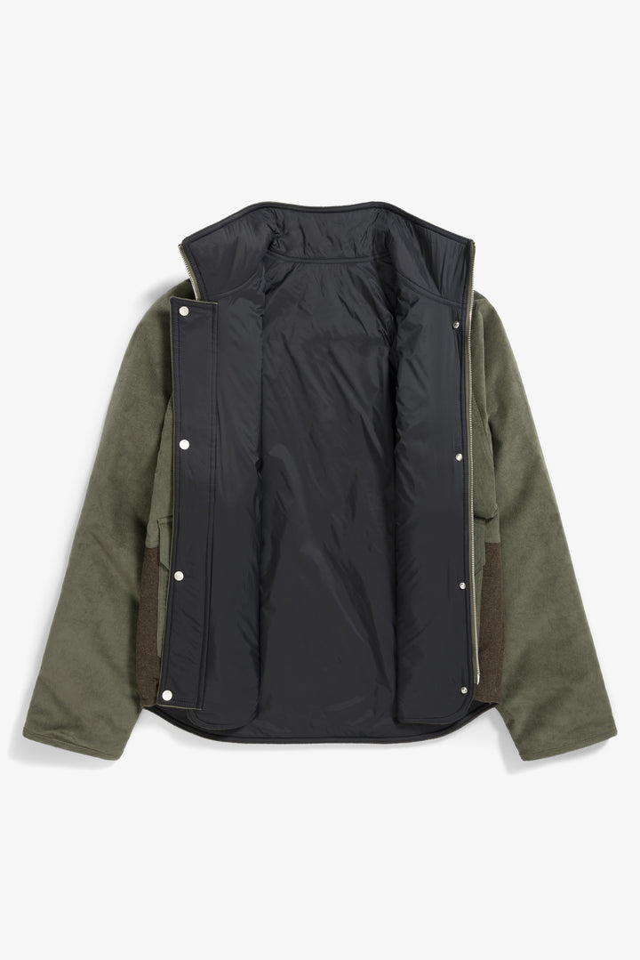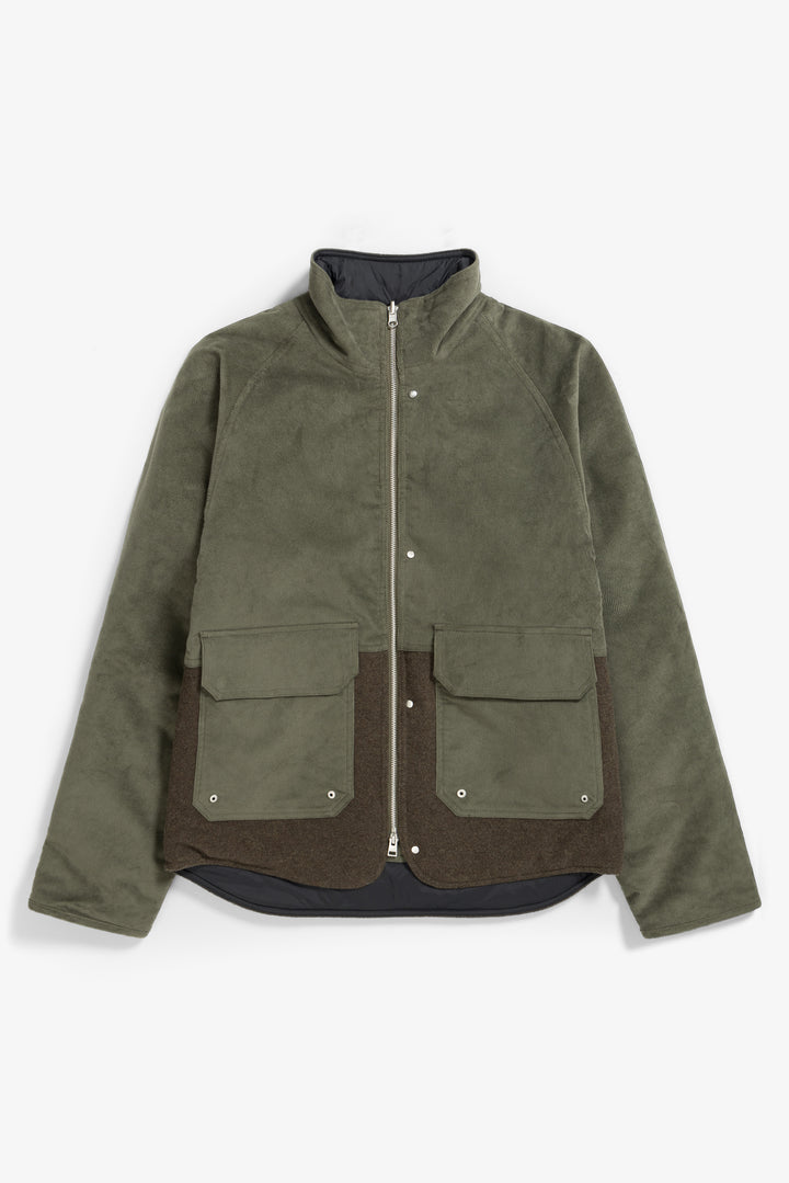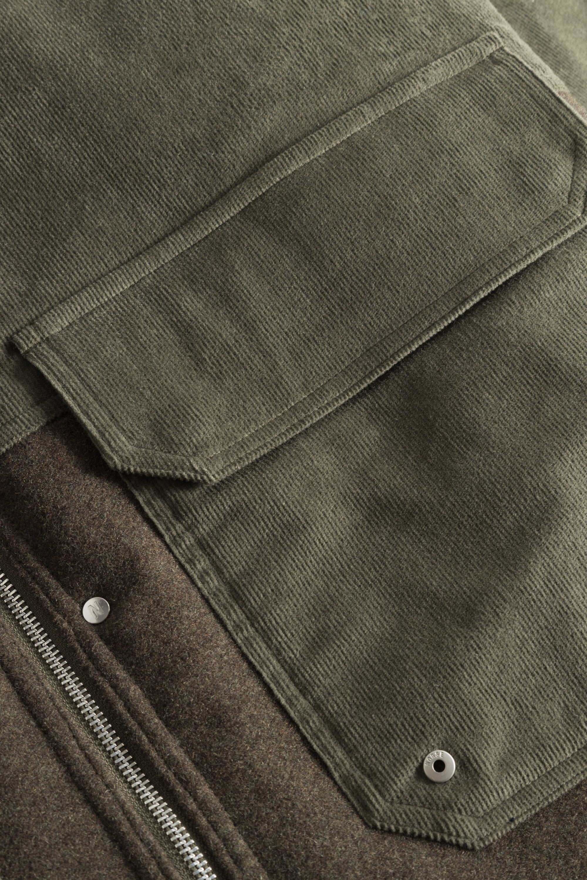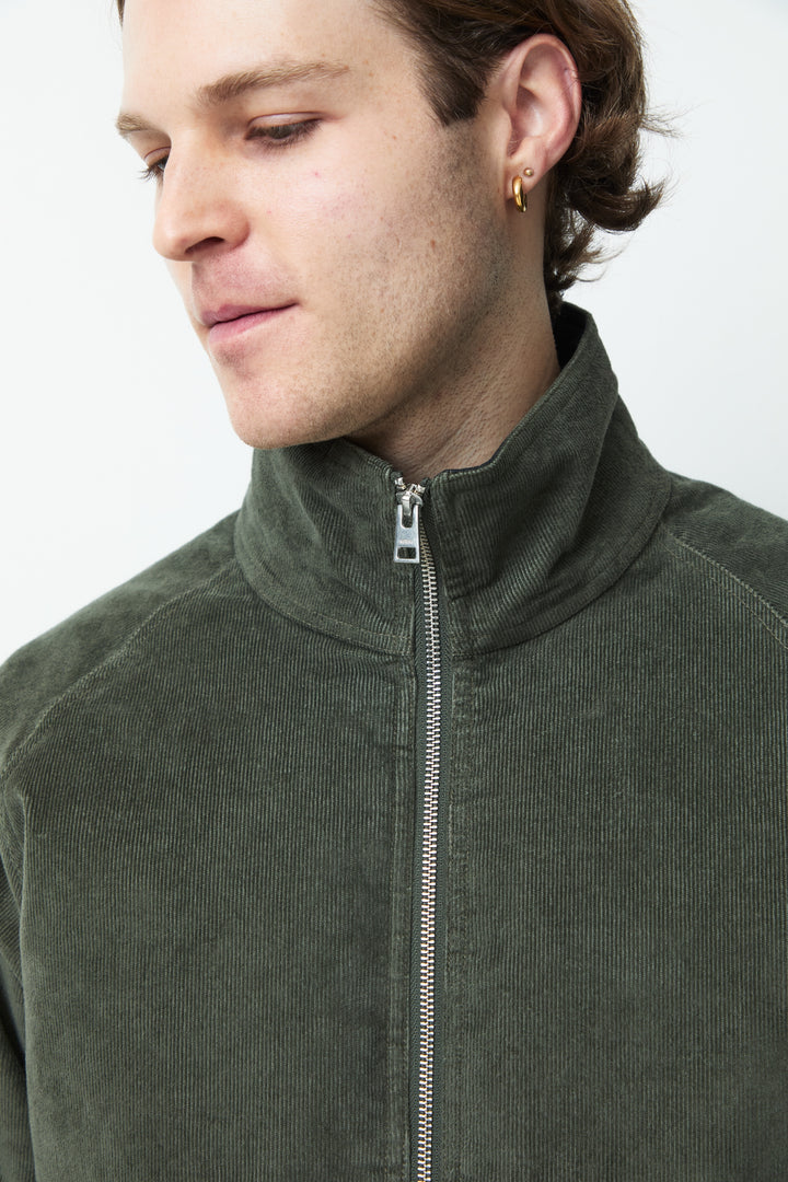 An insulated zip-through jacket, constructed from a combination of corduroy and Melton wool. A corduroy cloth woven with SOLOTEX® yarns provides the base of the style, whilst durable Melton is used to panel the undersleeve, and lower body. This style has a shaped hem, raglan sleeves, and lower patch pockets. A convertible collar allows the wearer to zip up to the chin, or fold down for an open collar look. Finished with a zip front closure. SOLOTEX® is a yarn with a spring-like helical molecular structure giving excellent stretch and recovery for uncompromising comfort.