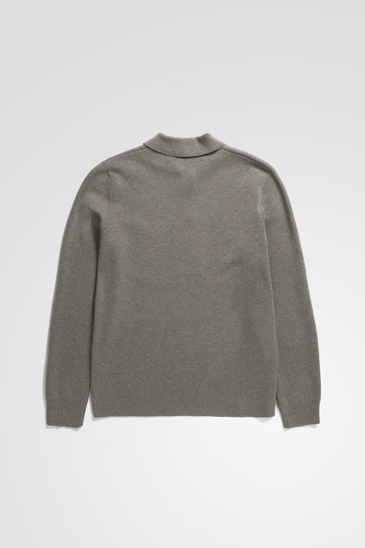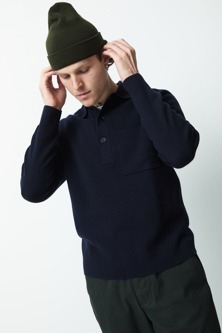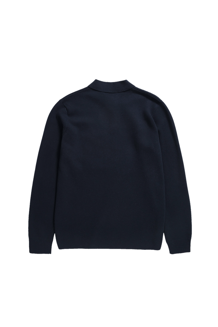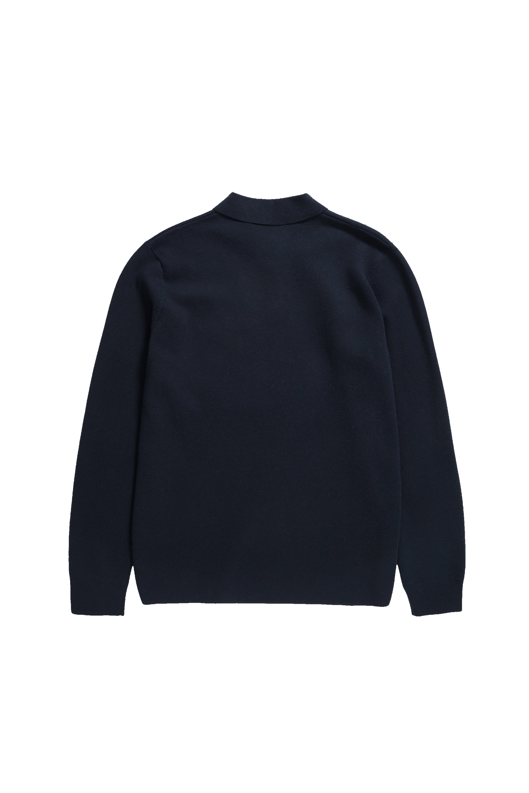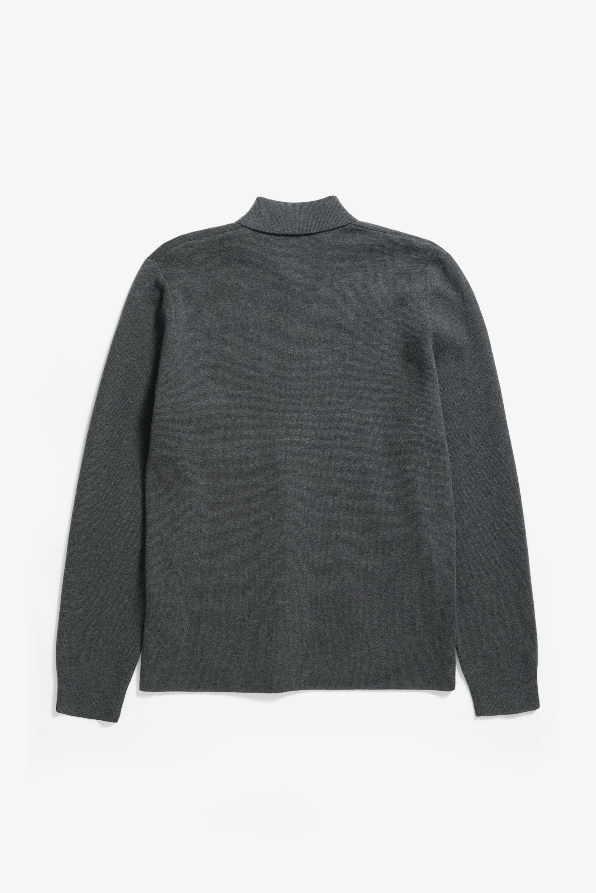 A polo knitted in a merino wool/cotton blend in a compact milano stitch. The milano stitch is a high density knit with characteristics closest to woven fabric. It has an uneven, structured surface yet both sides of the knit have the same stitch appearance. The two plain courses of full milano reduces most of the width way elasticity and as a result, full milano has a much better dimensional stability compared to other knit structures. The style is constructed with raglan sleeves and finished with pockets at the front, self-start hem and ribbed cuffs. It features a milano knitted collar and a full zip at center front.
