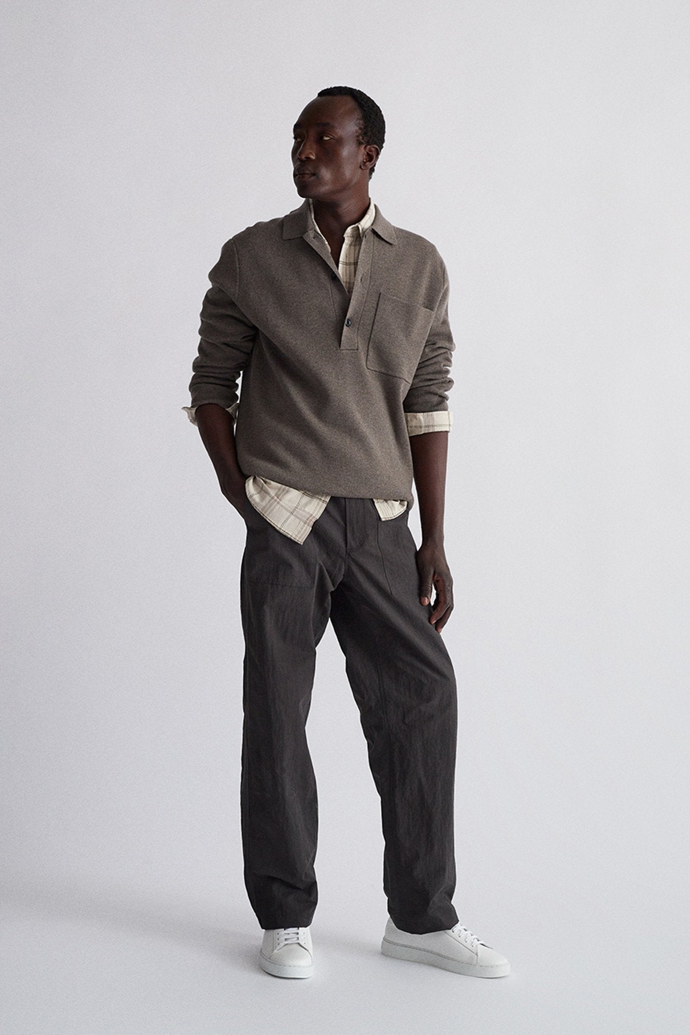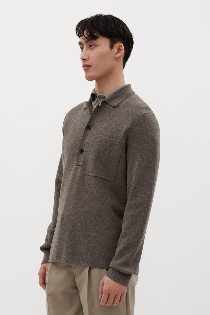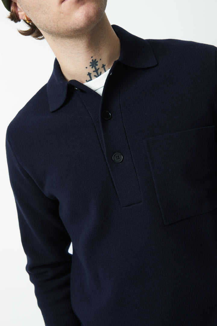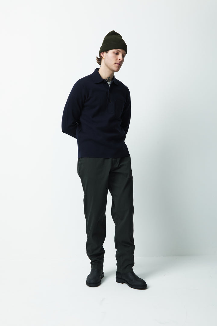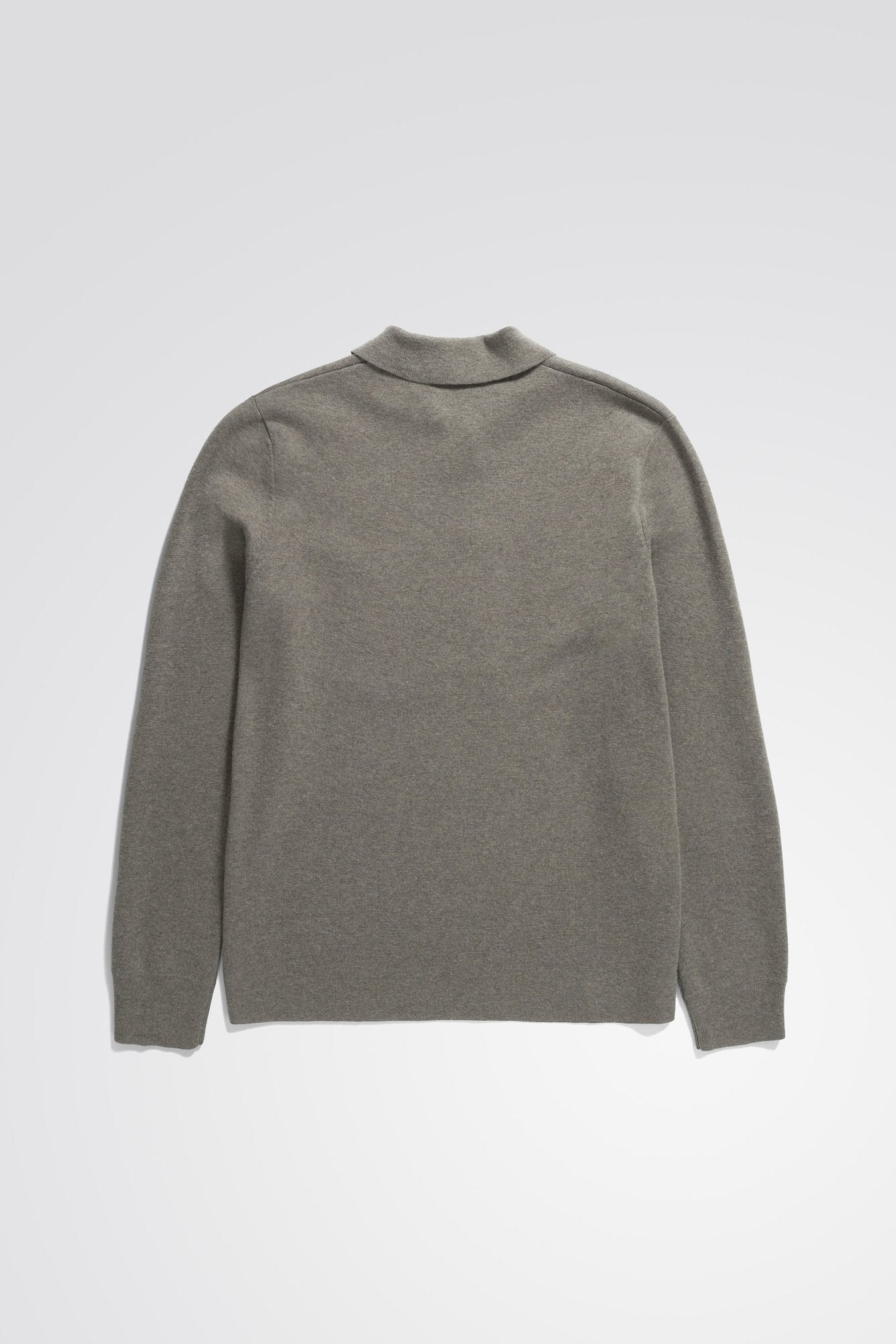 A polo knitted in a merino wool/cotton blend in a compact milano stitch. The milano stitch is a high density knit with characteristics closest to woven fabric. It has an uneven, structured surface yet both sides of the knit have the same stitch appearance. The two plain courses of full milano reduces most of the width way elasticity and as a result, full milano has a much better dimensional stability compared to other knit structures. The style is constructed with raglan sleeves and finished with pockets at the front, self-start hem and ribbed cuffs. It features a milano knitted collar and a full zip at center front.