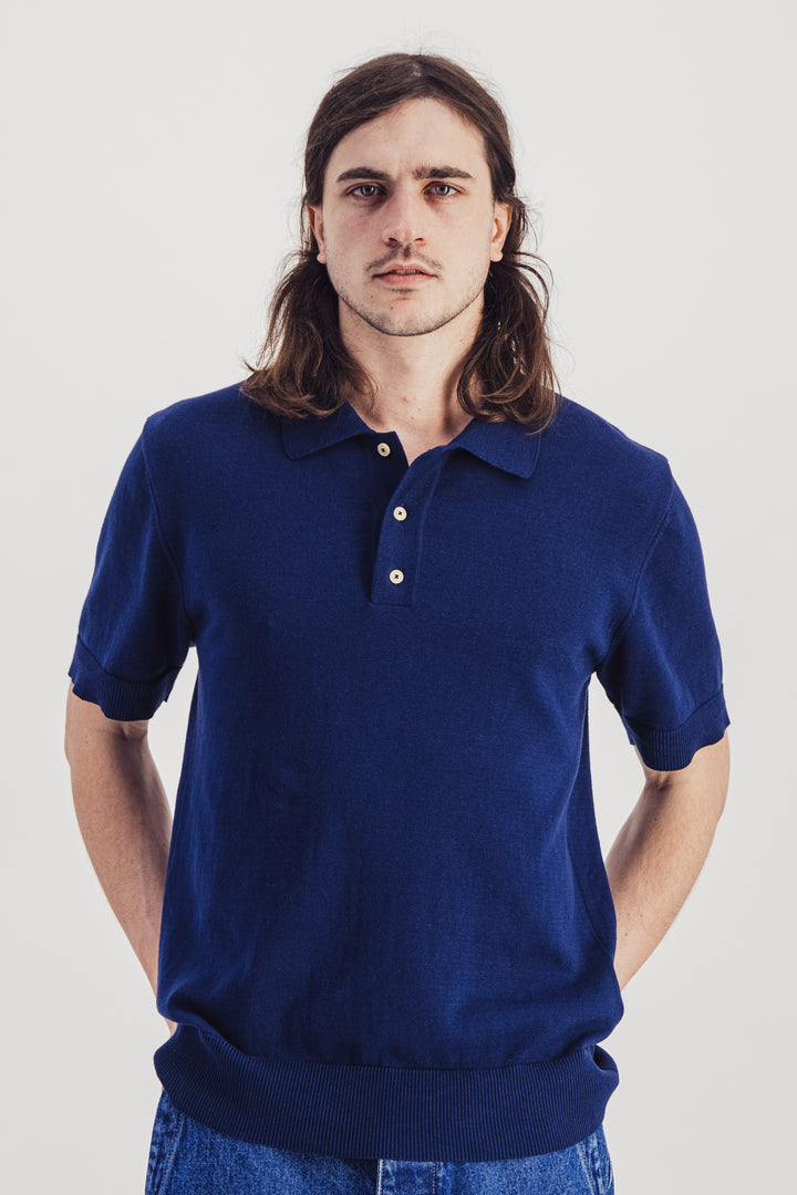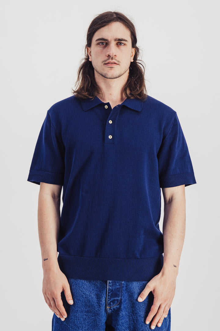 Short-sleeved knitted polo shirt in soft, 100% cotton yarn, finished with a single rib at the bottom and cuffs and completed with a half-open placket with Eco Gala buttons.