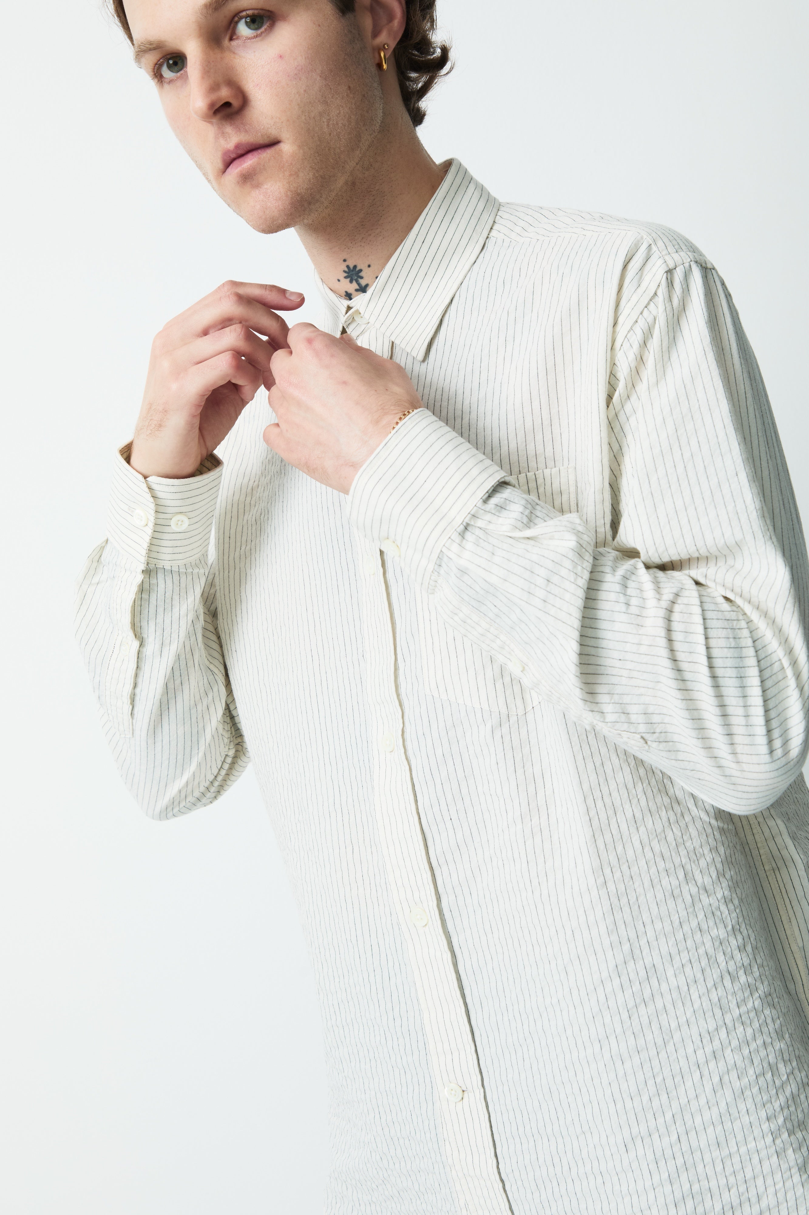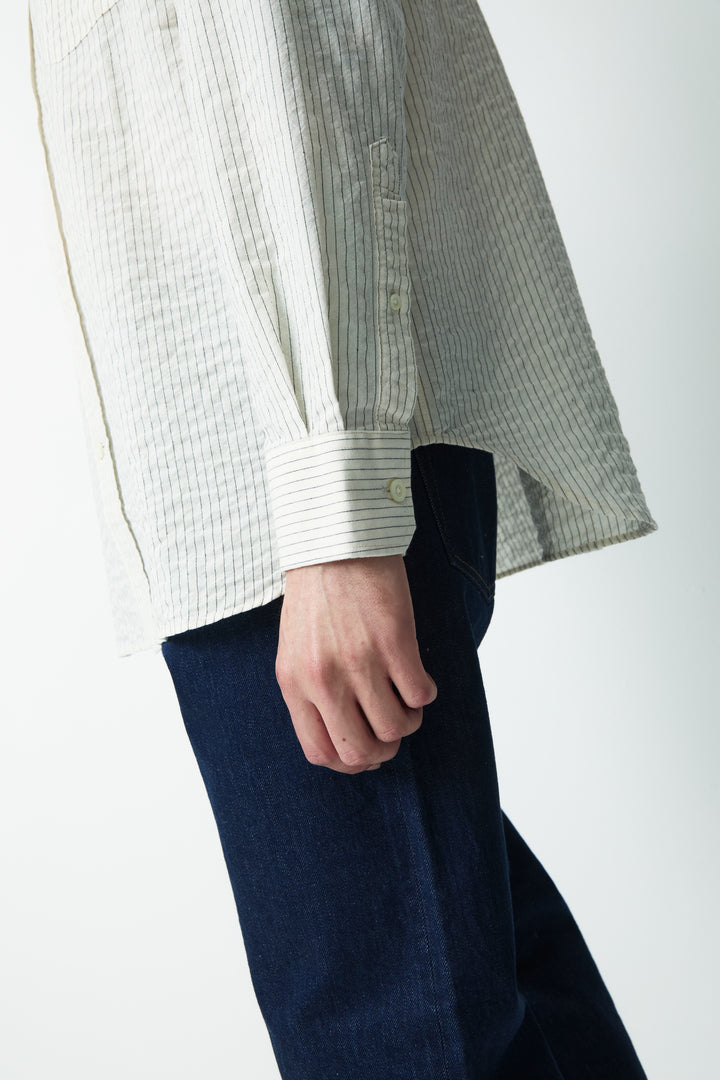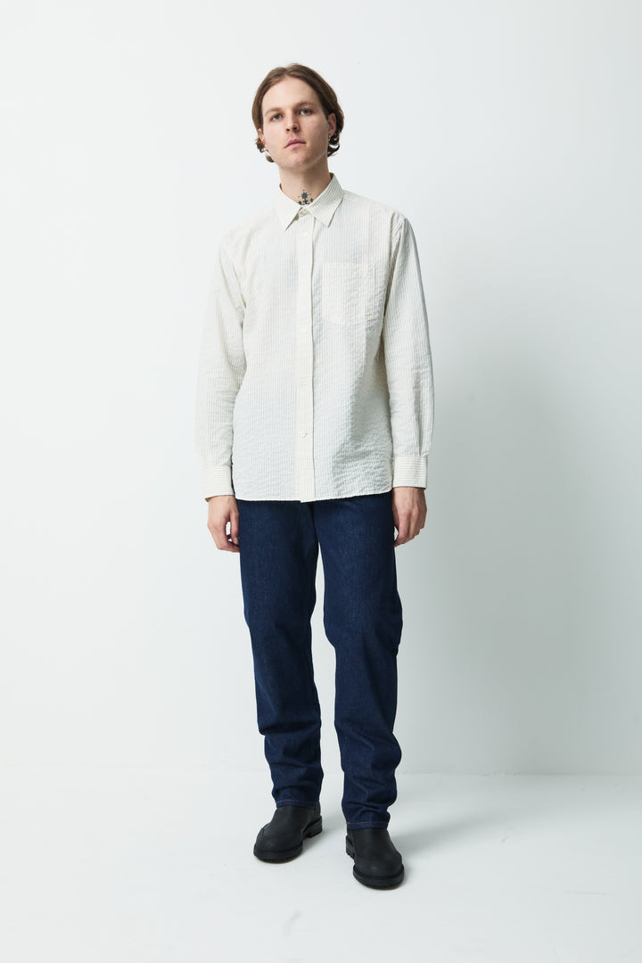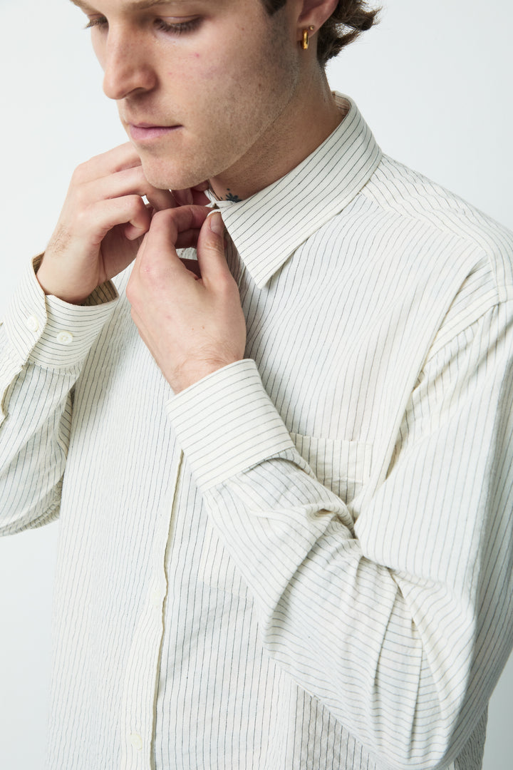 A relaxed fitting shirt, with a wider cut body. This shirt is constructed with an Italian fabric that has a fine stripe design, and a slight crinkled appearance. This shirt is finished with a chest pocket and mother-of-pearl buttons.