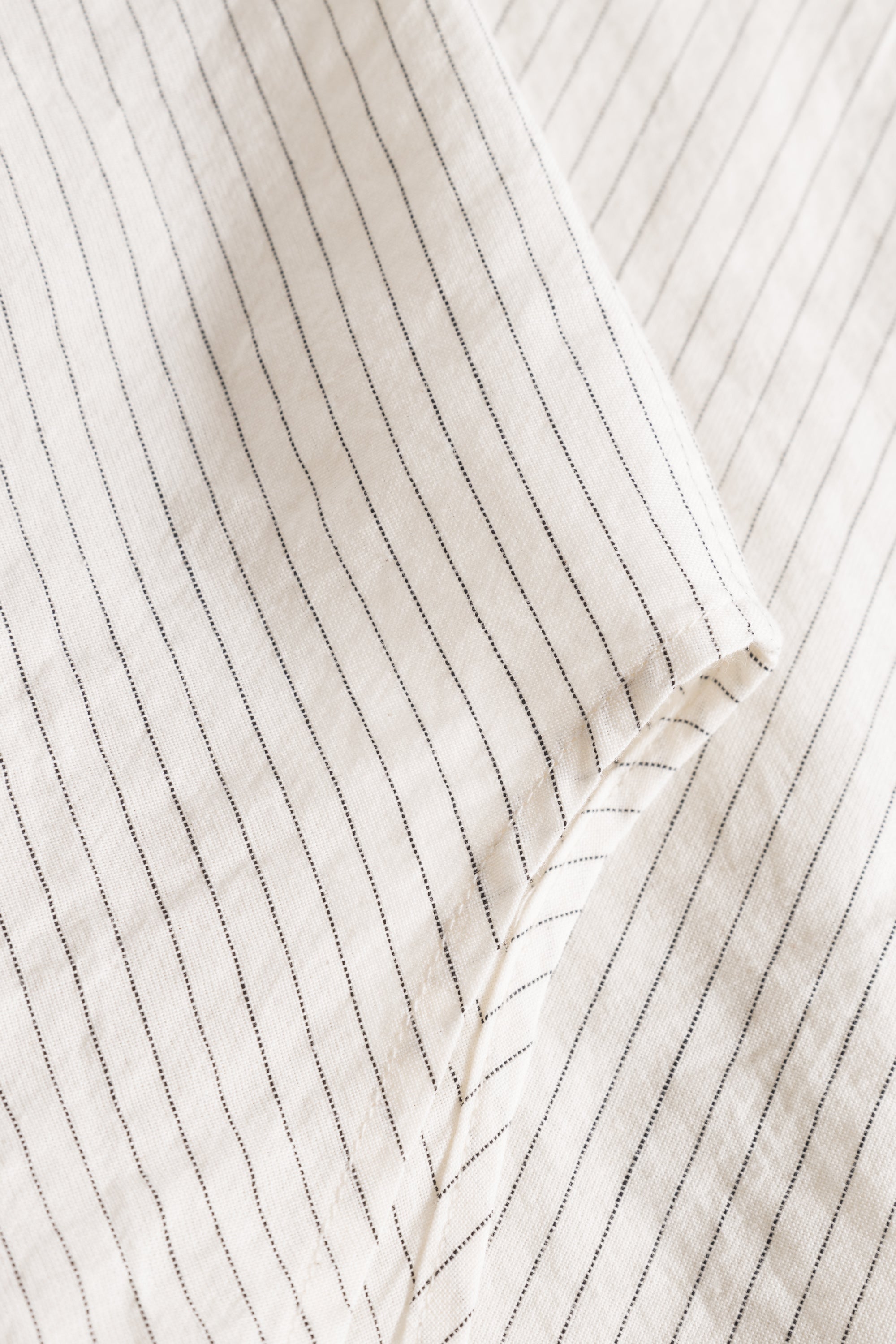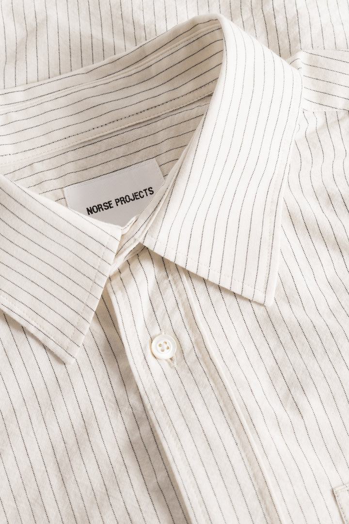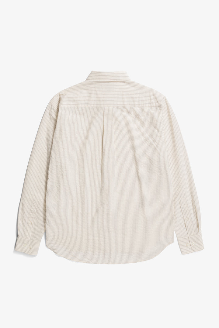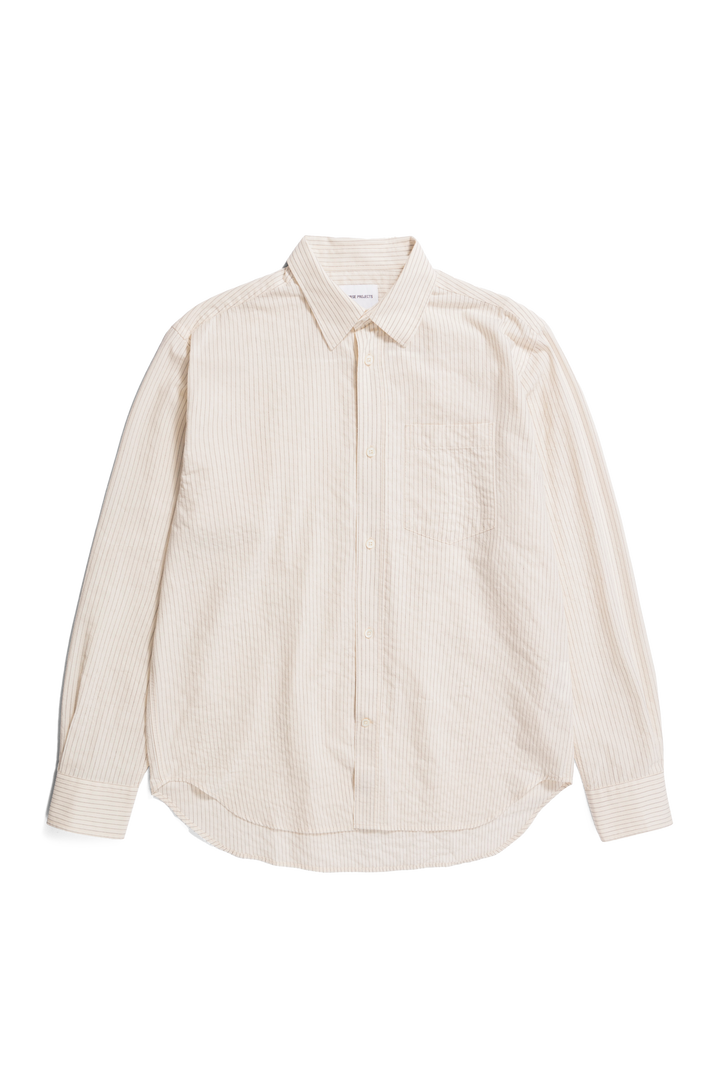 A relaxed fitting shirt, with a wider cut body. This shirt is constructed with an Italian fabric that has a fine stripe design, and a slight crinkled appearance. This shirt is finished with a chest pocket and mother-of-pearl buttons.