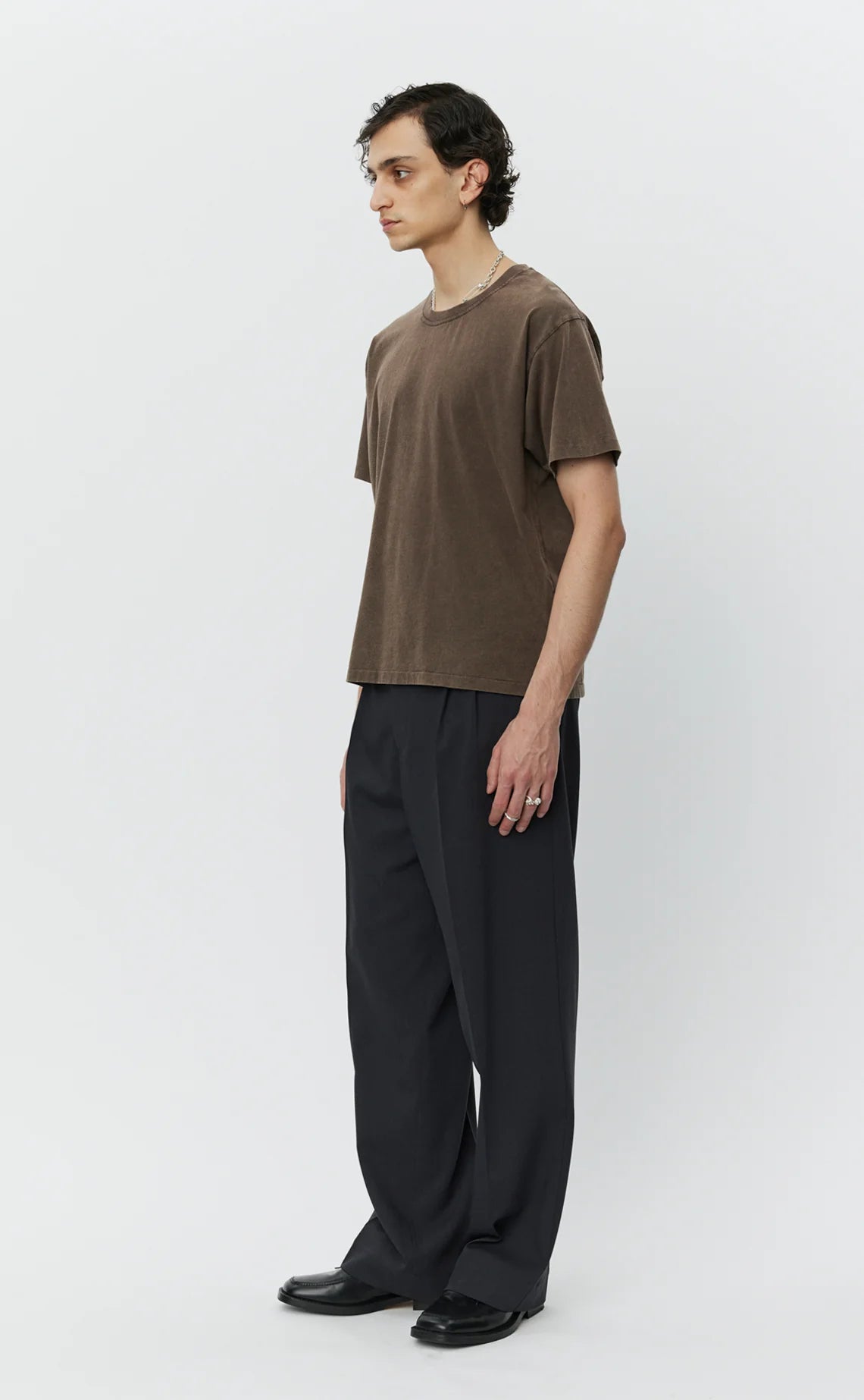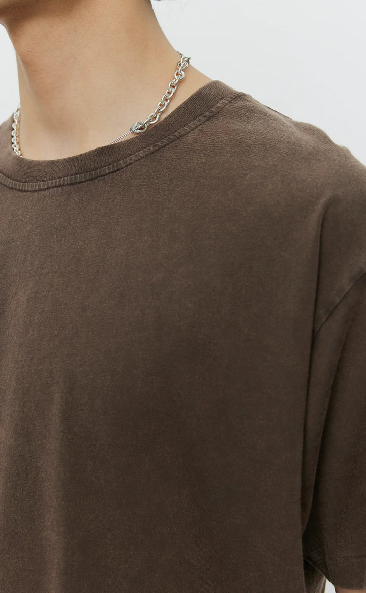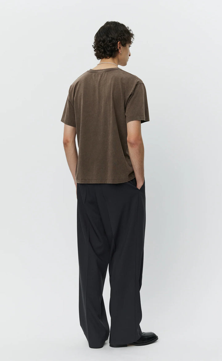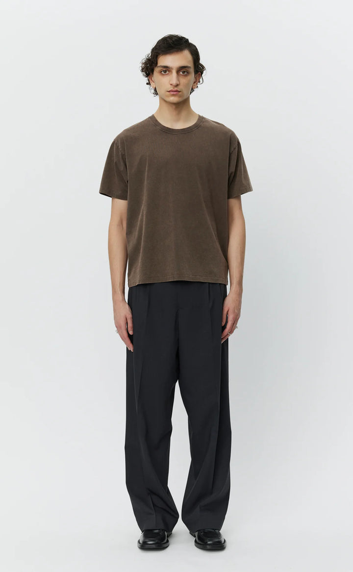 The New Tee has a boxy fit with a slightly cropped silhouette. Cut from a garment dyed organic cotton jersey in a washed copper brown.