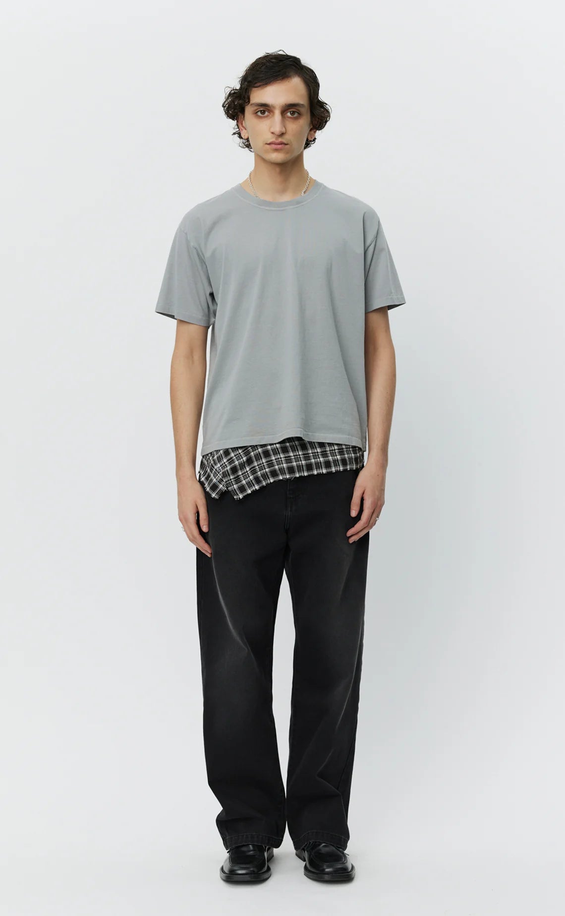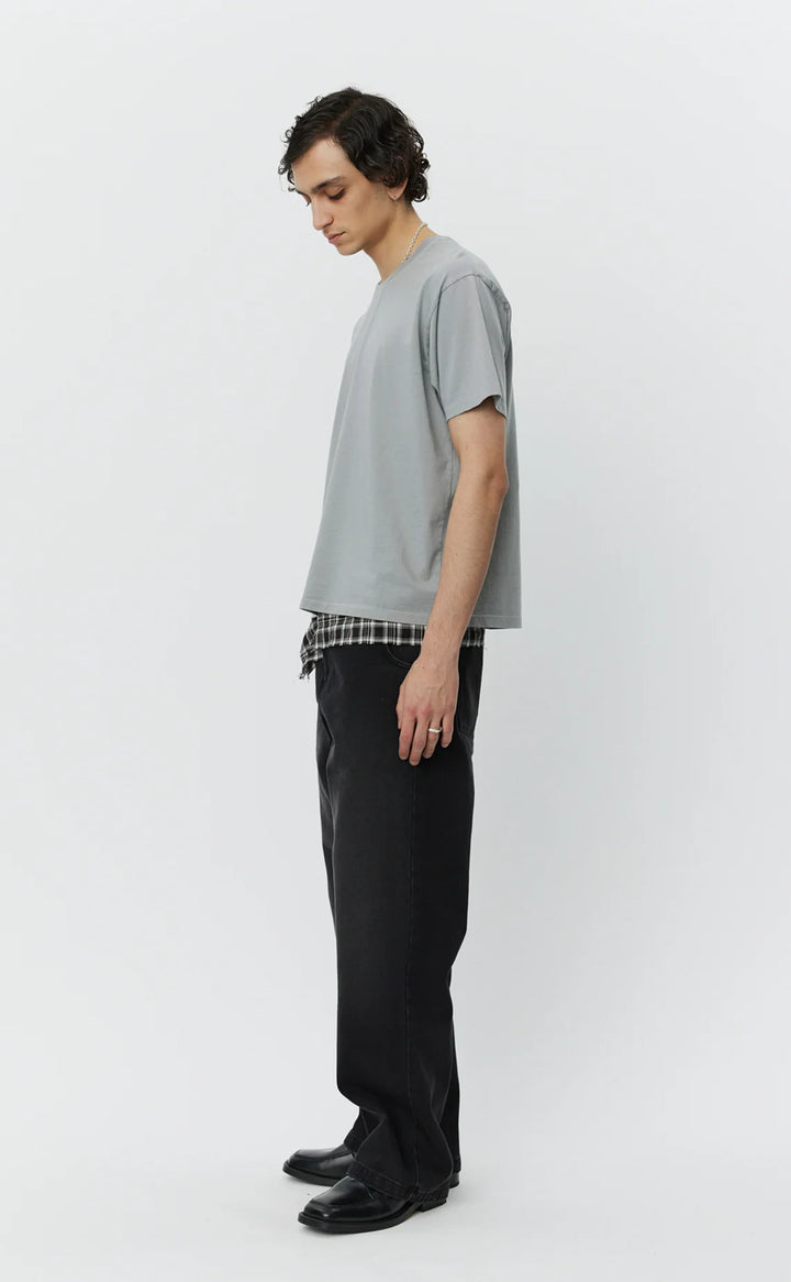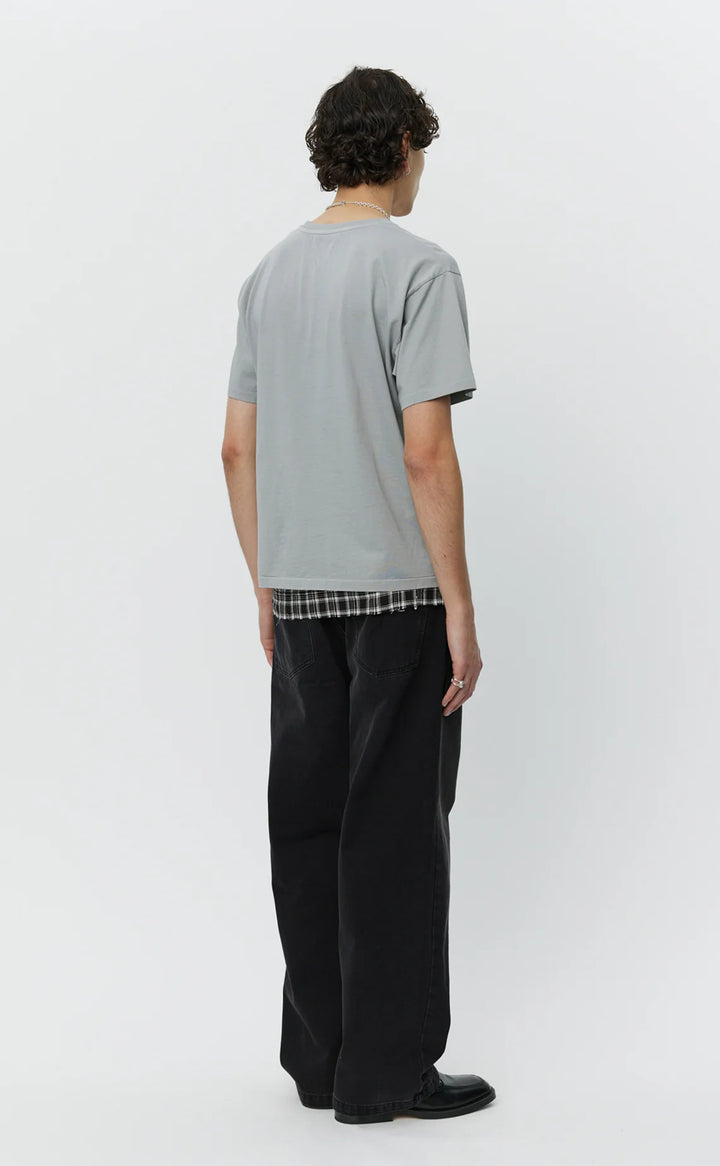 The New Tee has a boxy fit with a slightly cropped silhouette. Cut from a garment dyed organic cotton jersey in a washed copper brown.