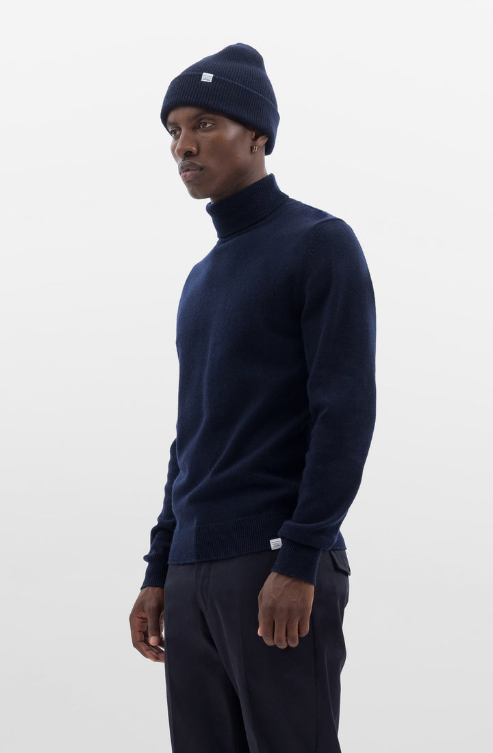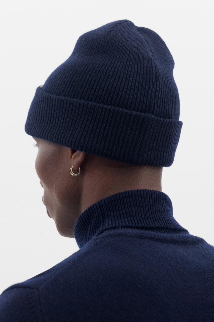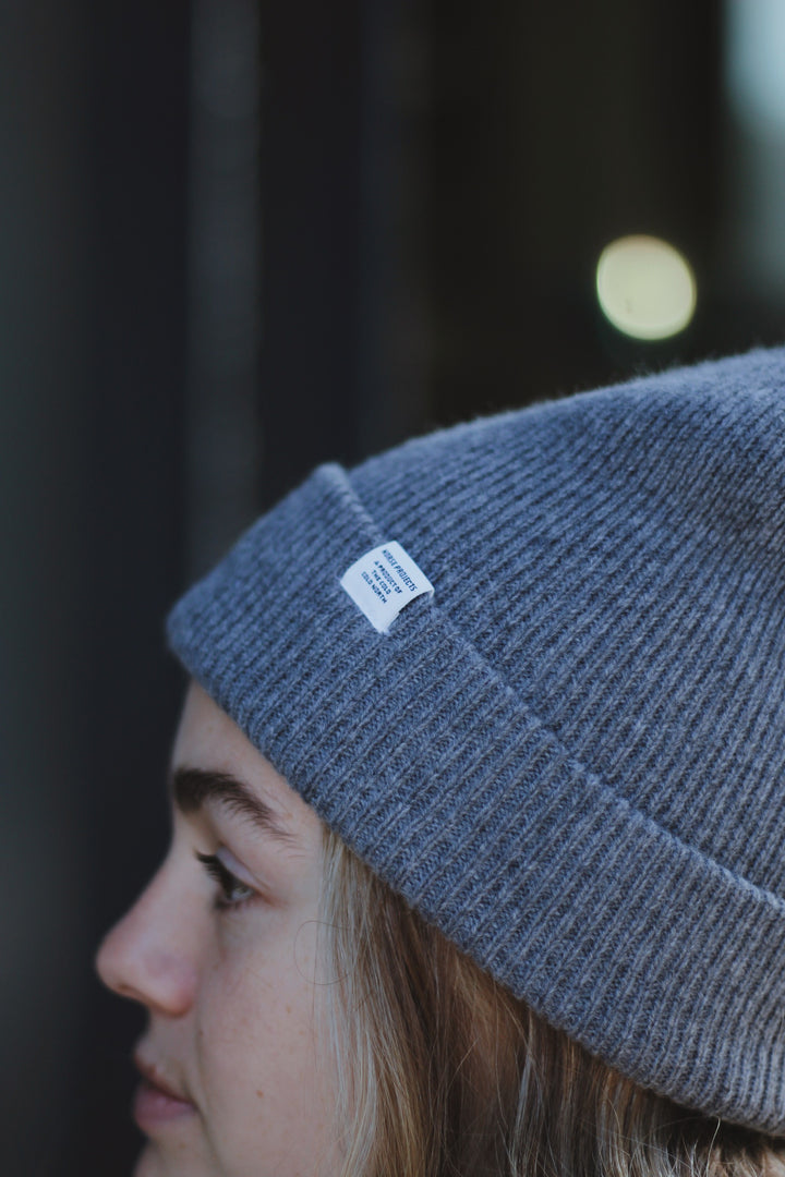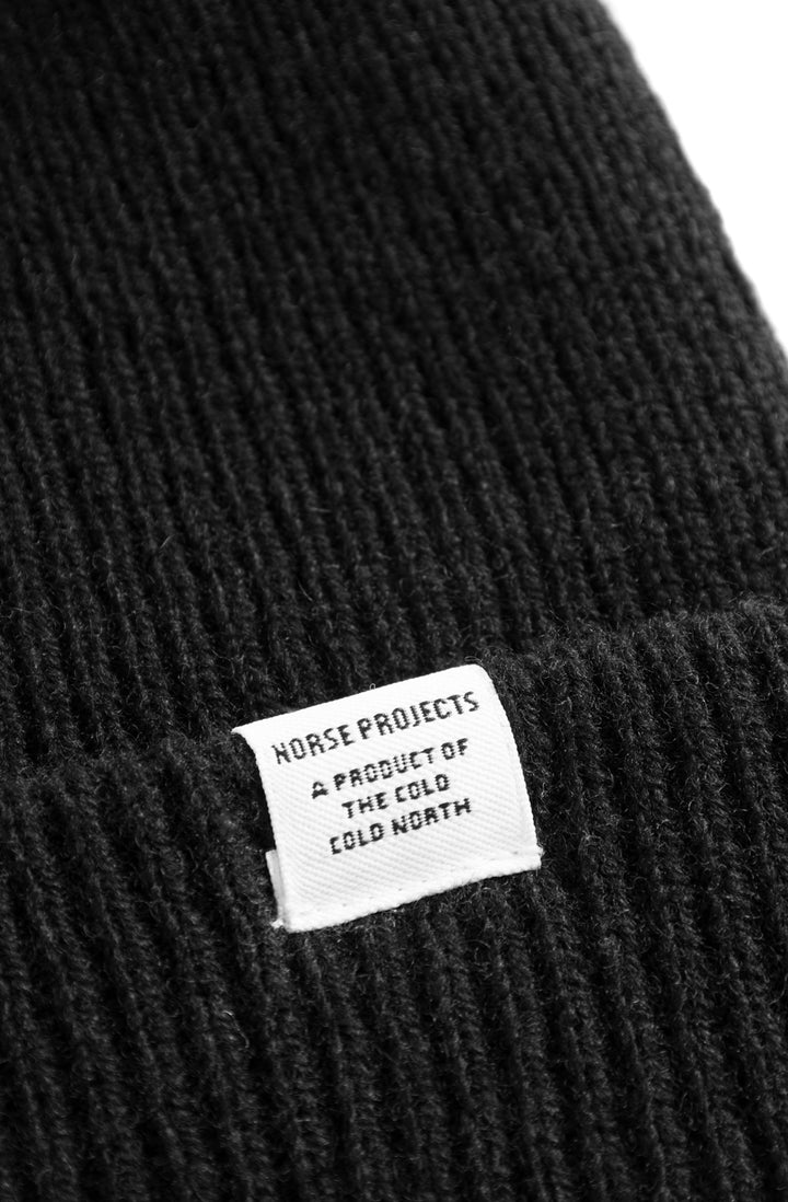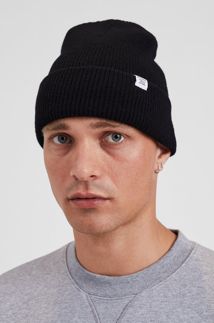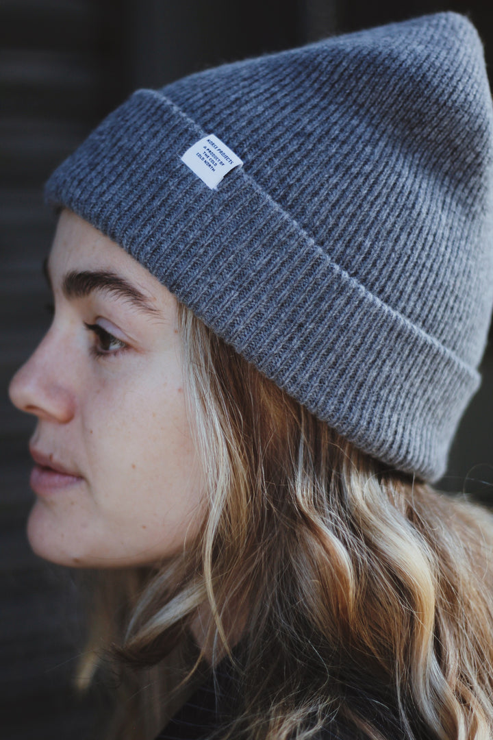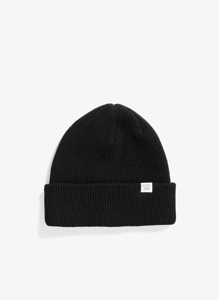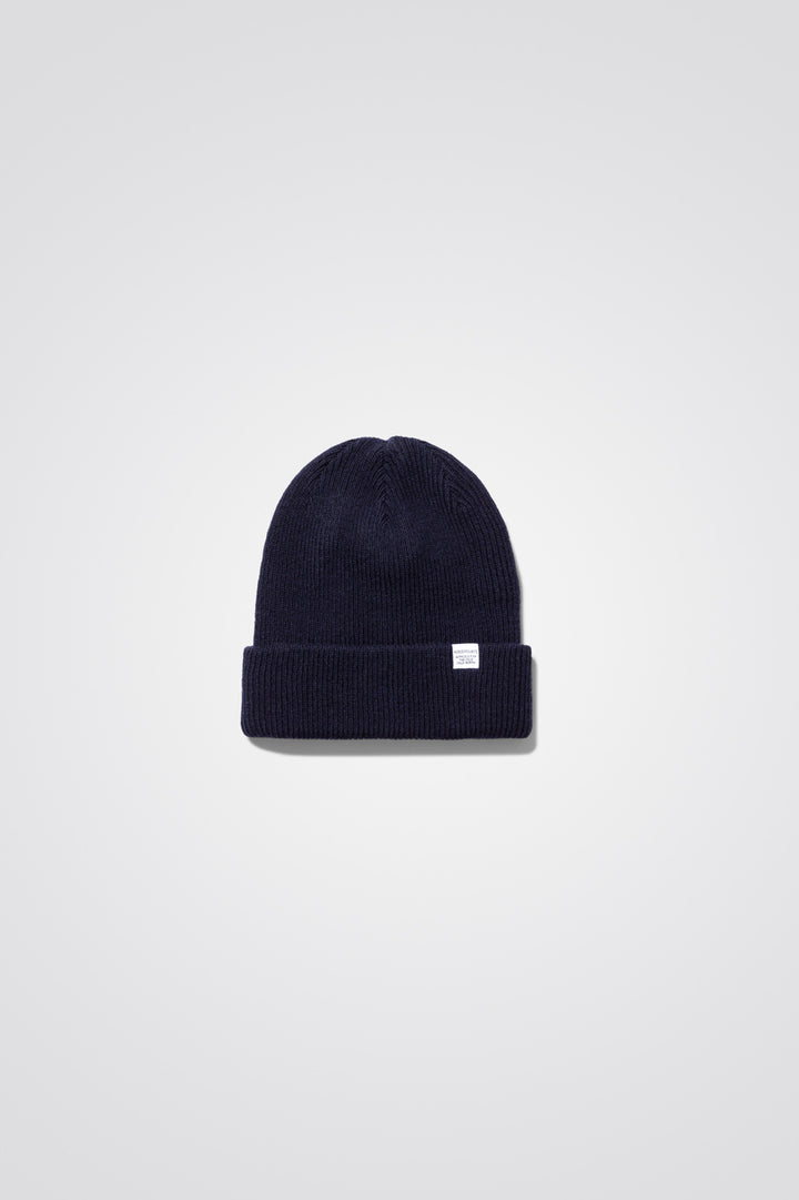 A beanie knitted in a simple 1x1 rib in Italian merino lambswool yarn. Finished with a signature Norse Projects tab label.