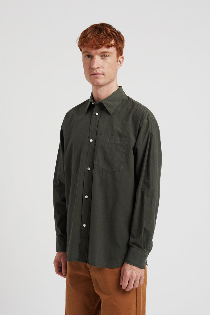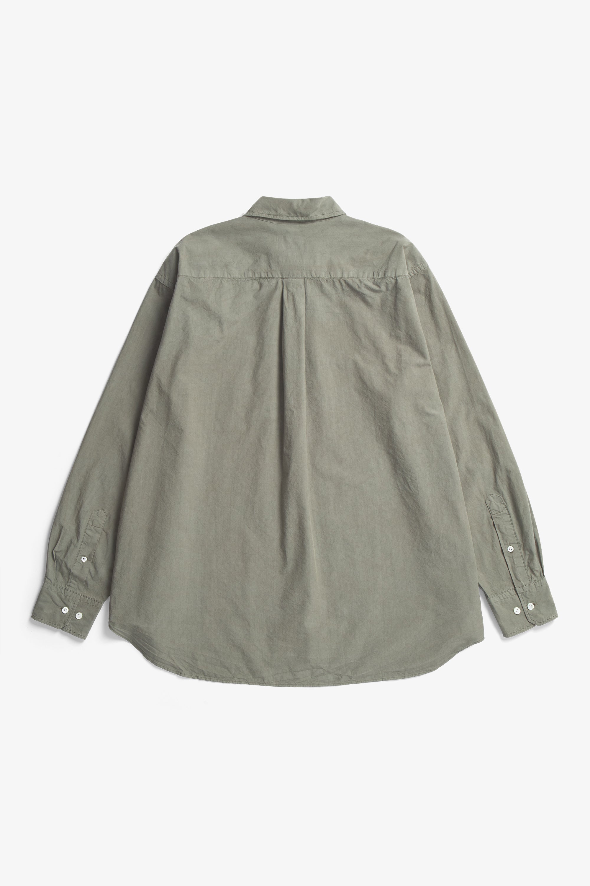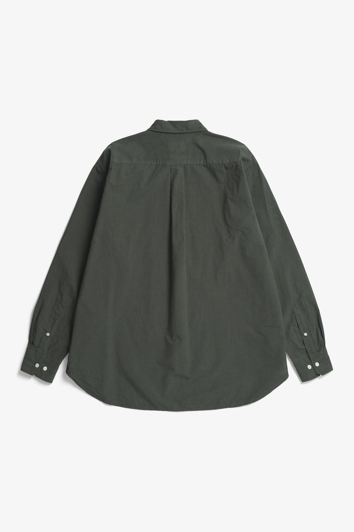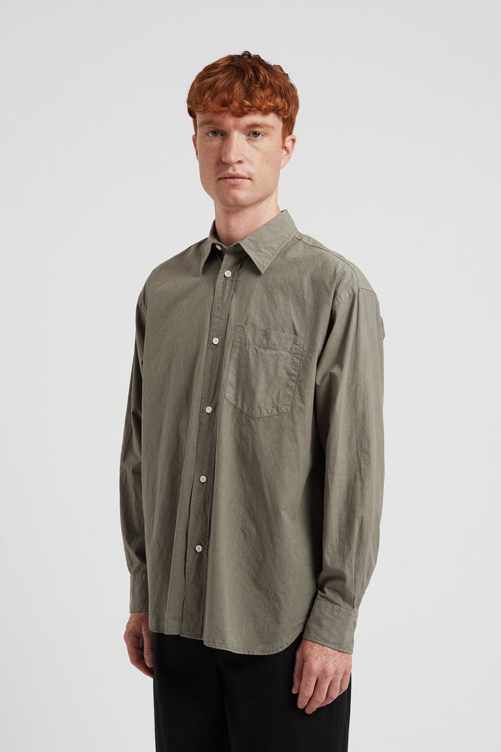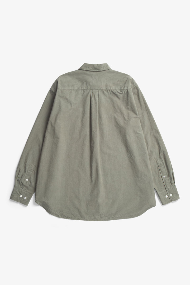 An oversized fitting shirt, with a wider body cut from a crisp Tencel® blend poplin. This shirt is garment dyed in a way that achieves a distinct softened hue, and an effortless look. Features two fatigue chest pockets, box pleat at the back, shaped hem and mother of pearl buttons.