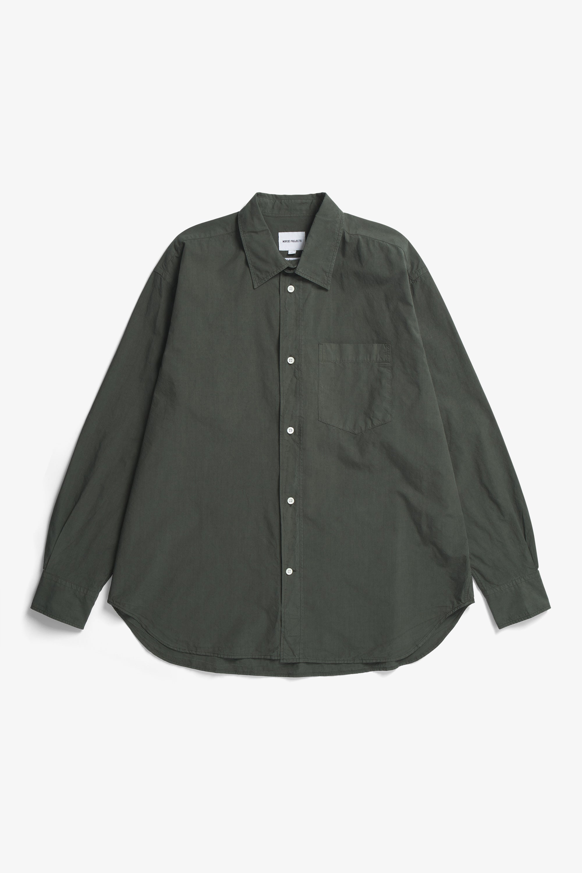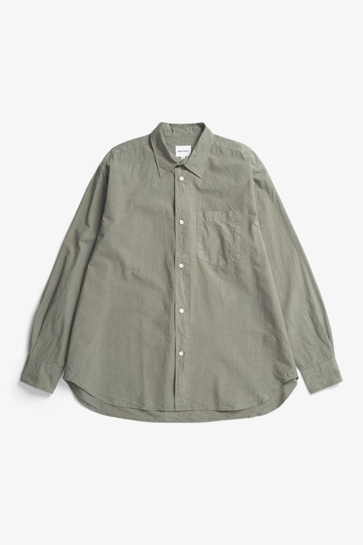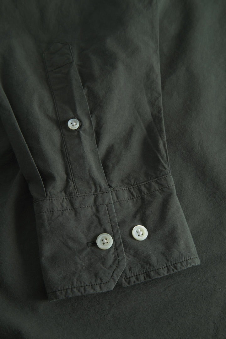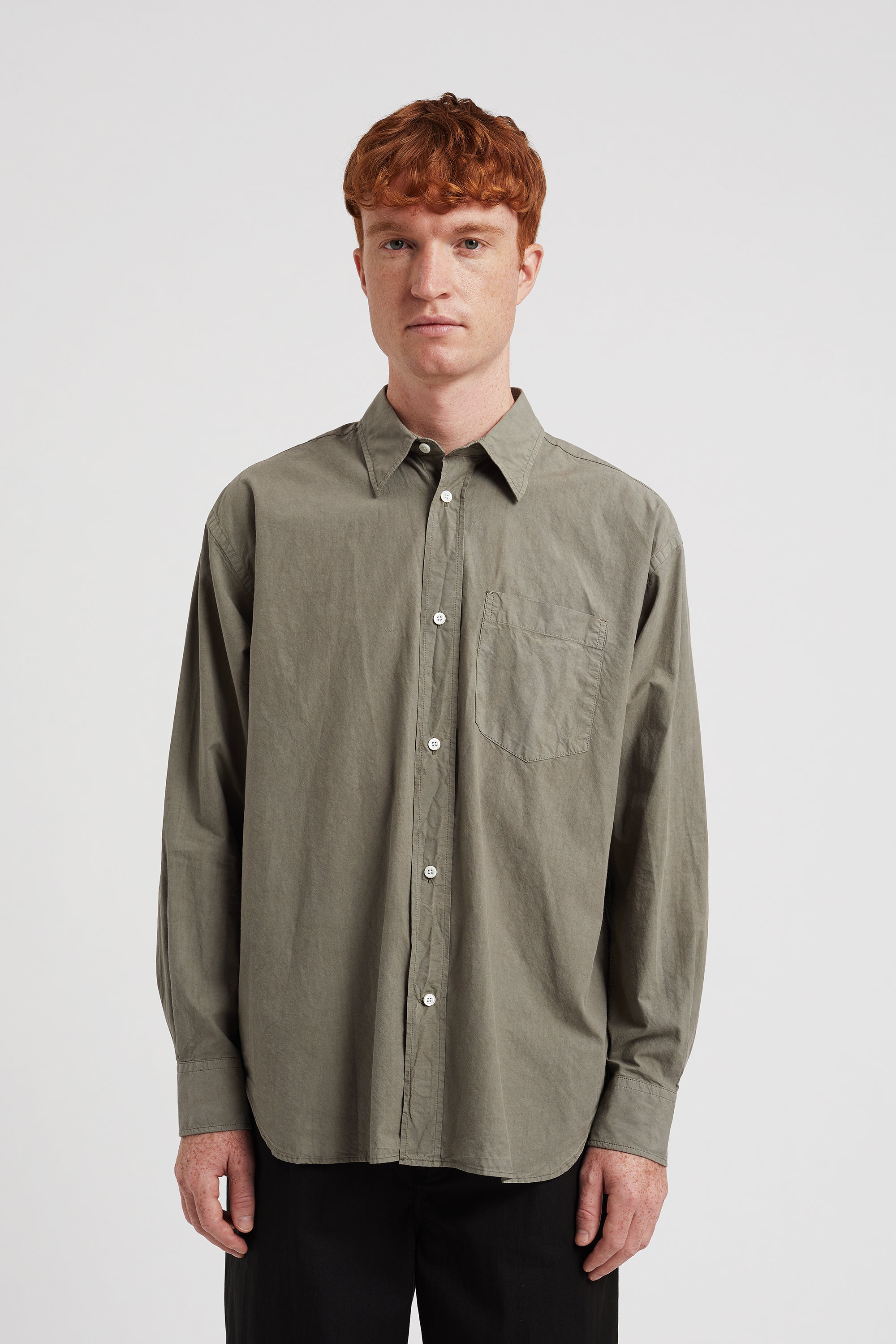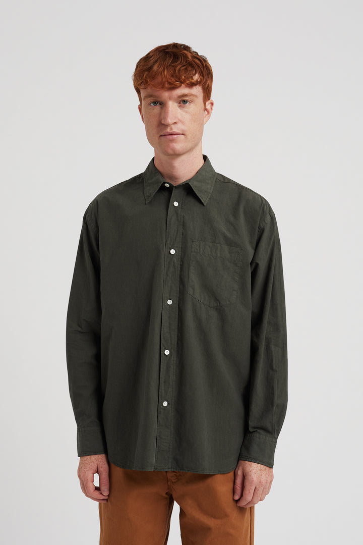 An oversized fitting shirt, with a wider body cut from a crisp Tencel® blend poplin. This shirt is garment dyed in a way that achieves a distinct softened hue, and an effortless look. Features two fatigue chest pockets, box pleat at the back, shaped hem and mother of pearl buttons.