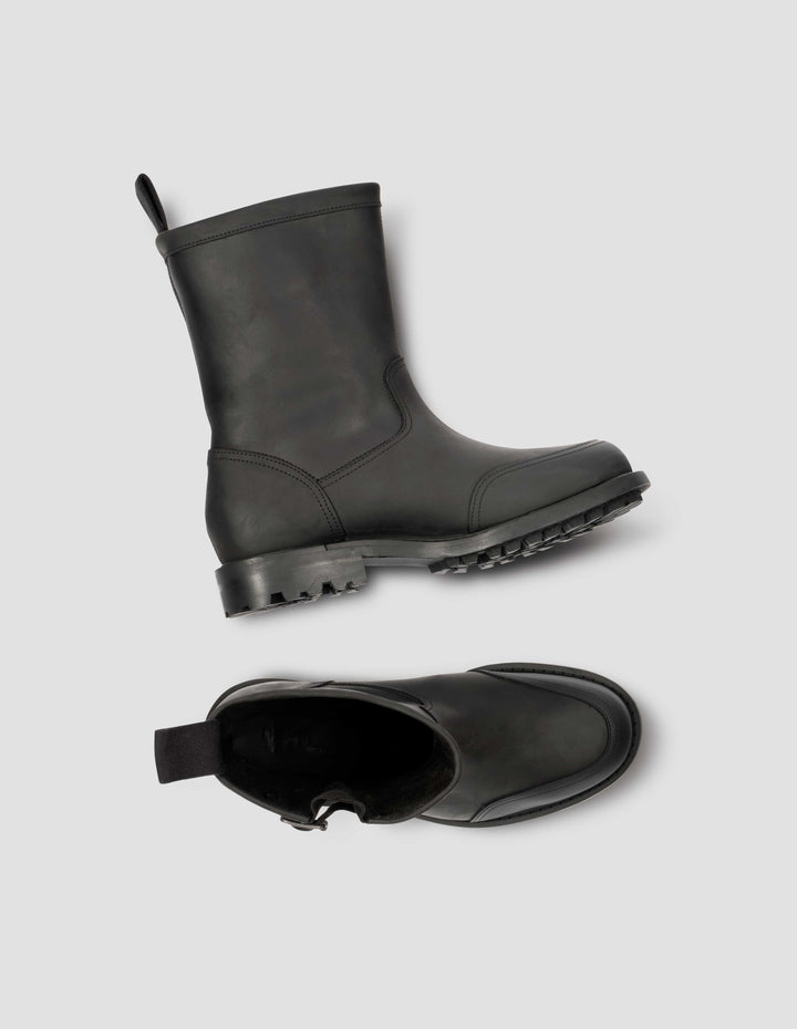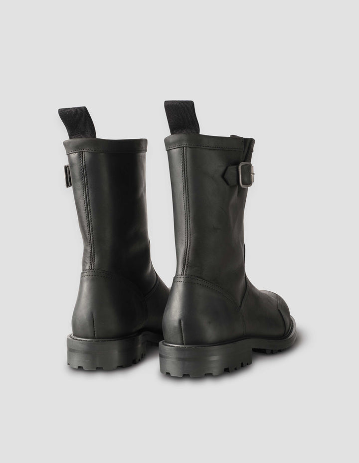 Leather pull on boot. Bound top edge and buckle adjust detail at calf.