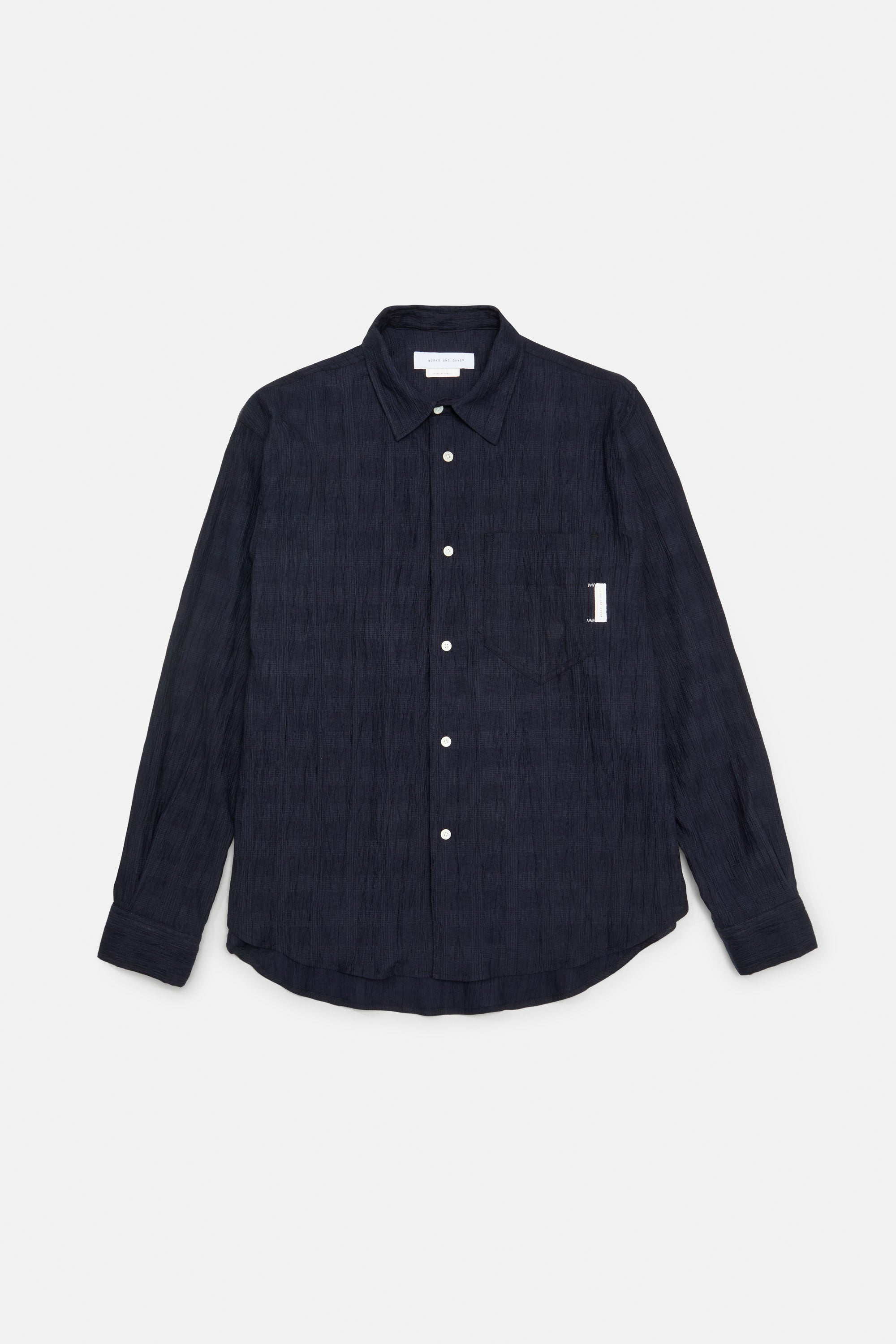 A full cut shirt fabricated in a regenerated rayon, with a subtle check pattern and a permanent wrinkled texture. Stitched with twin needle workwear details, a signature of Works and Days shirting. The fabric is a regenerated cellulose and recycled polyester blend, woven in Japan.