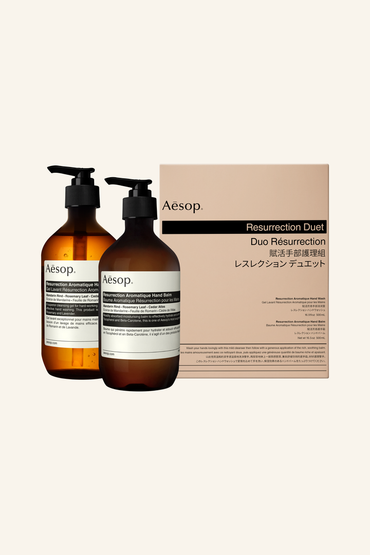 Enjoy Resurrection Aromatique Hand Wash and Resurrection Aromatique Hand Balm in concert to cleanse, nourish and soften hard-working hands.
