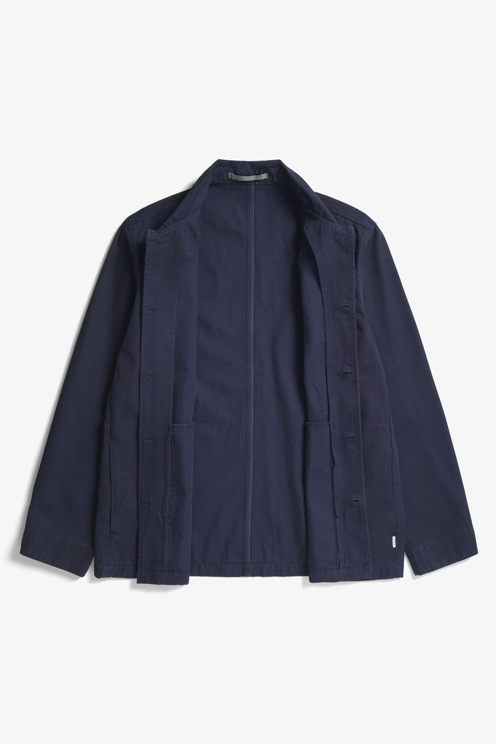 The Norse Standard Twill Overshirt is cut from densely woven twill, offering a clean, defined structure and a straight, boxy fit. It can be worn as an overshirt or lightweight jacket. Crafted in Portugal, it features a single patch pocket on the chest, side seam pockets, and corozo buttons.