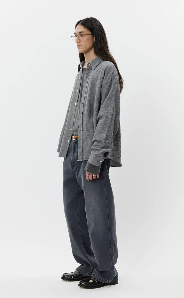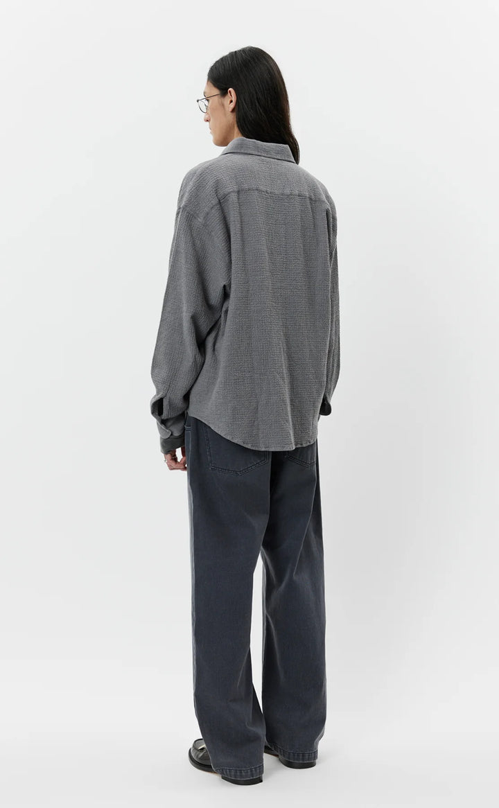 The Vacation Shirt has a loose boxy fit with drop shoulders and a curved hem. Featuring spread collar and button placket. Cut from a soft seersucker fabric with a blend of cotton and cashmere, in a speckled mid grey.